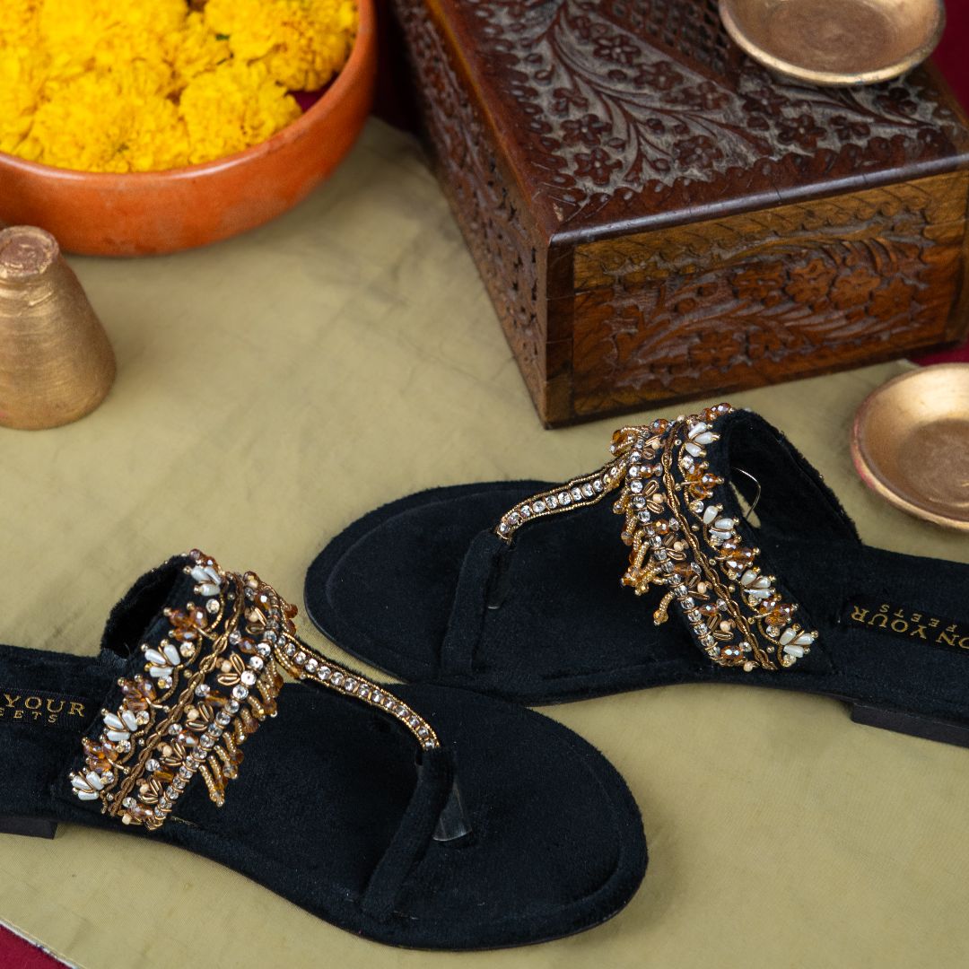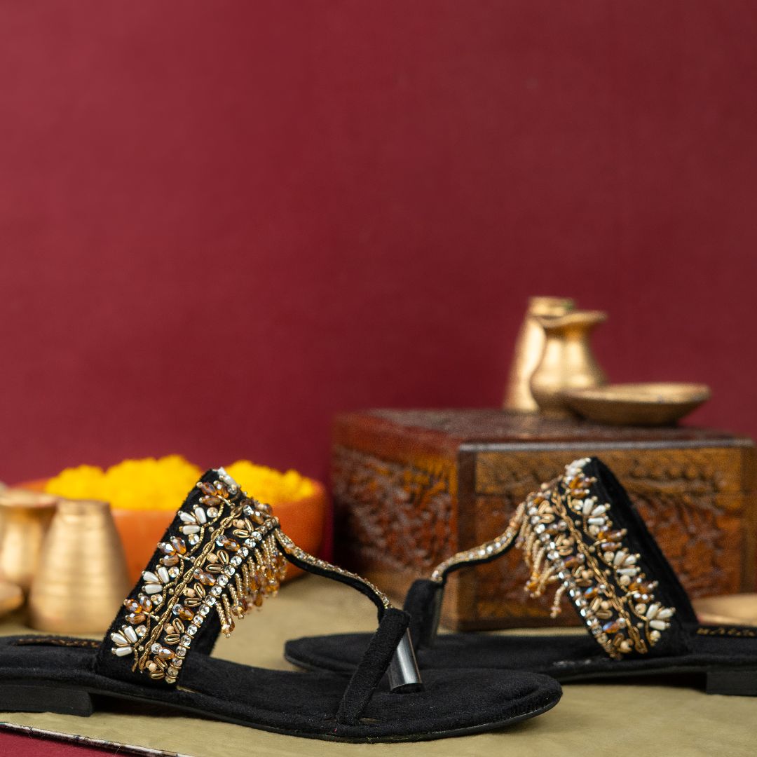 The Nayab Kolhapuri by On Your Feets is a timeless blend of traditional craftsmanship and refined elegance. Designed in a rich black tone, this Kolhapuri features intricate hand embellishments that add a luxurious touch while preserving its classic silhouette.