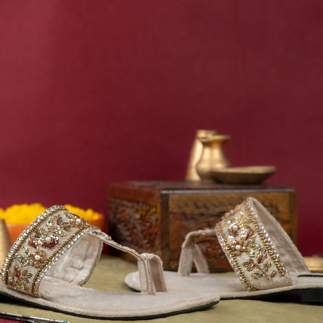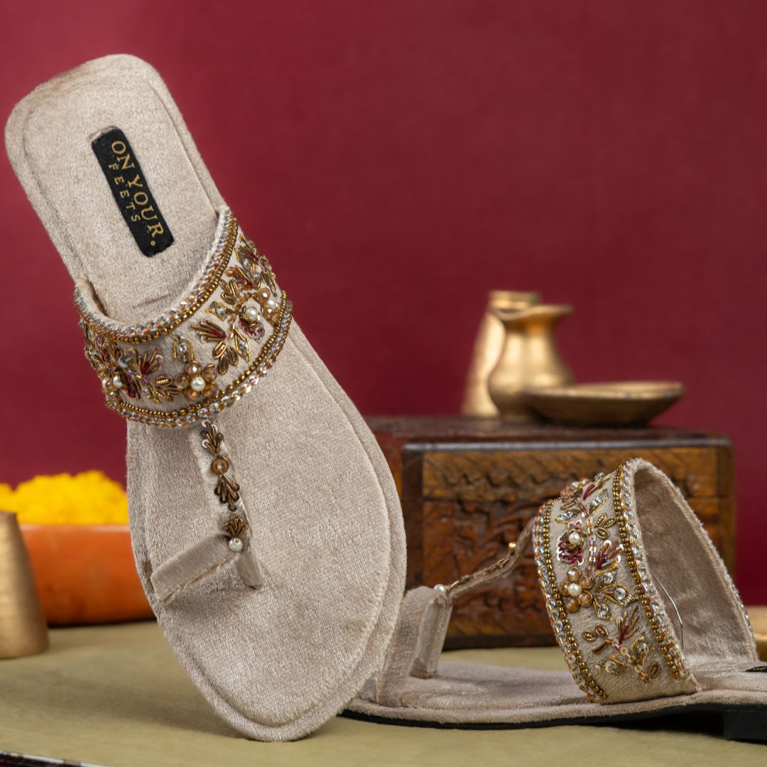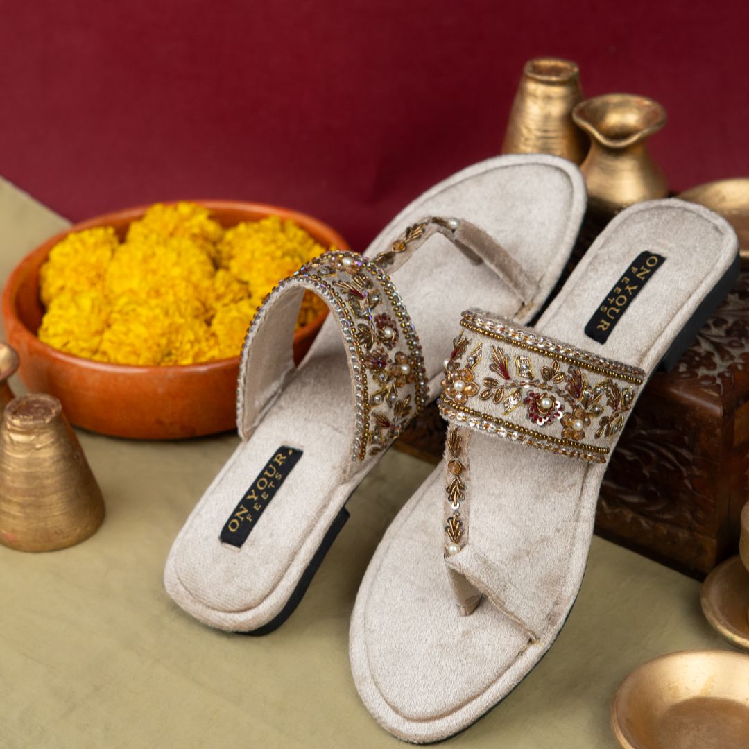 Elevate your ethnic style with the Zar-e-Ivory Royale Kolhapuri by ON YOUR FEETS. Designed on a soft ivory base, this elegant Kolhapuri features intricate hand embroidery adorned with pearls, zari detailing, and golden bead accents. The refined toe-ring silhouette adds a traditional charm while offering a graceful, secure fit.