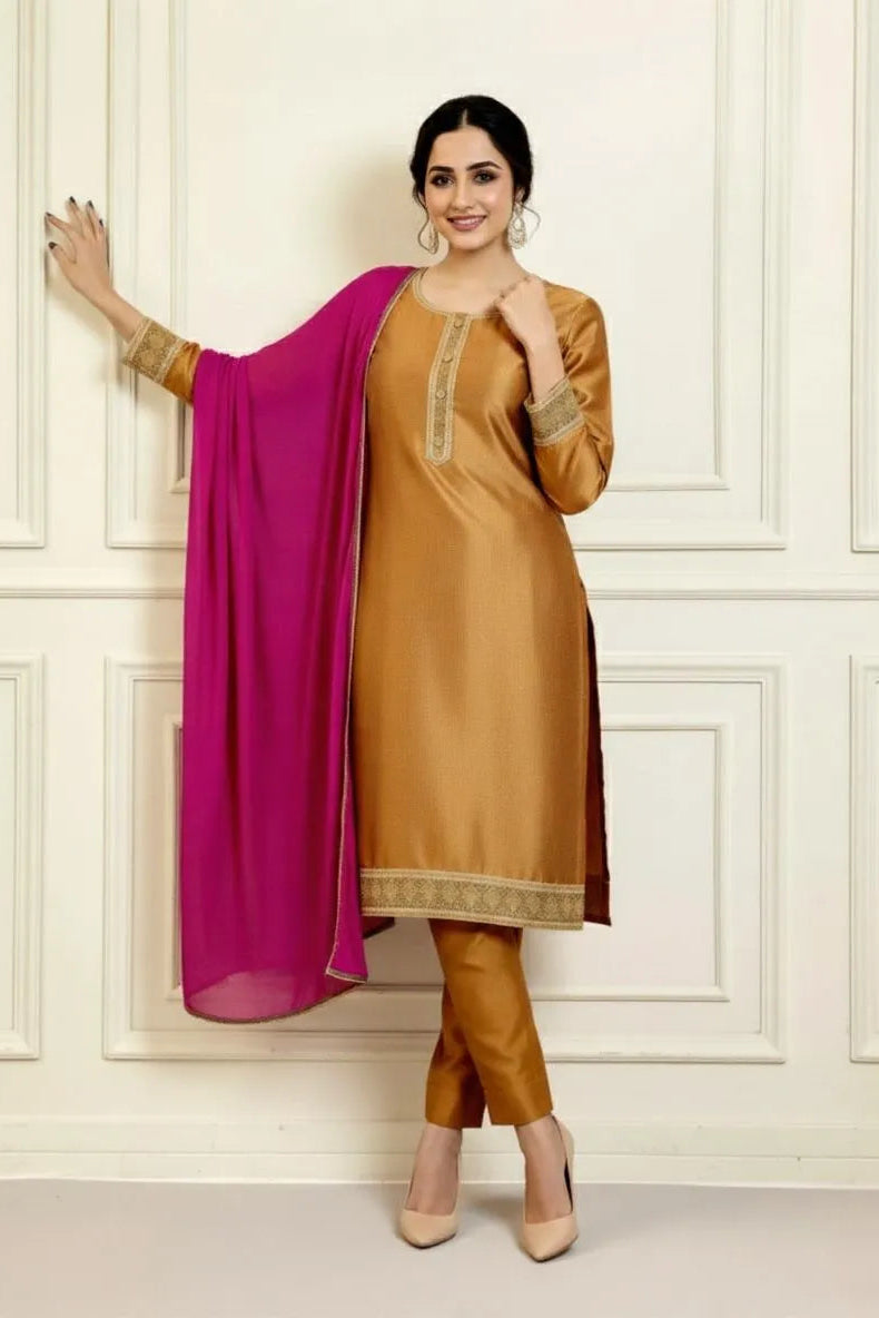 This exquisite three pieces suit crafted from luxurious dobby fabric. Adorned with intricate soft cooper hand and machine embroidery, the top boasts a stunning visual appeal. The embroidery featuring gold adds a vibrant touch with all-over sequin work