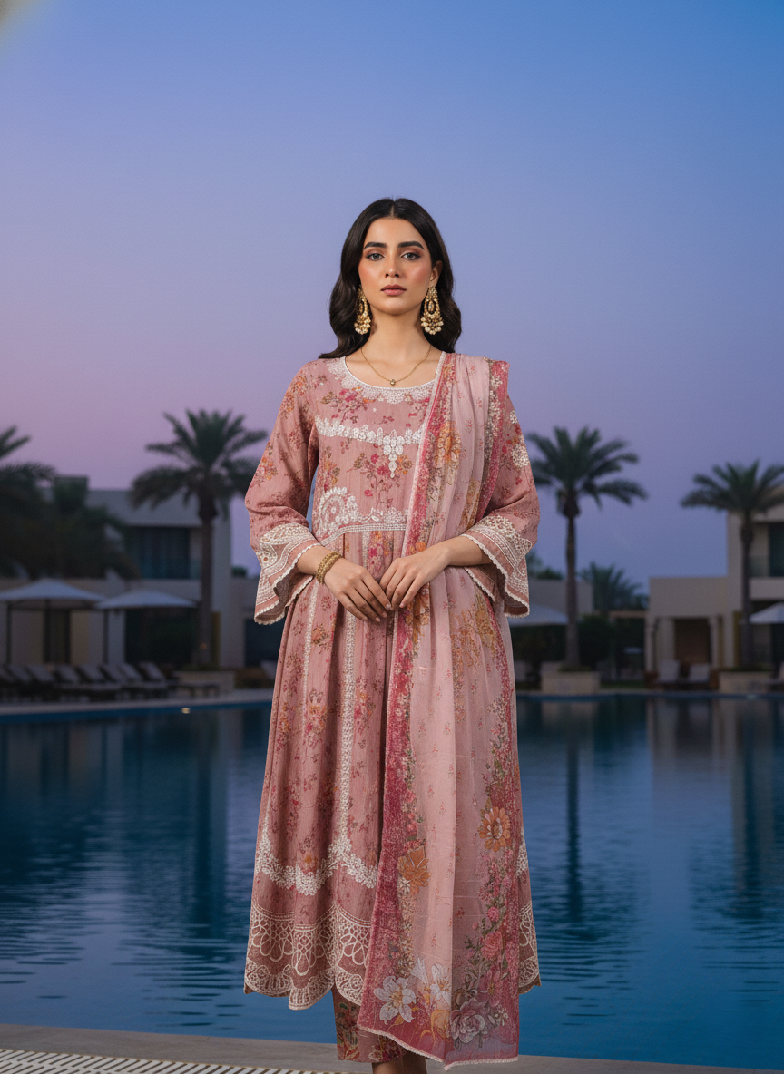 Each 3-piece set includes a stitched embroidered and digitally printed PP Staple frock, a complementary premium dupatta, and a coordinating trouser, making it a complete expression of couture craftsmanship.