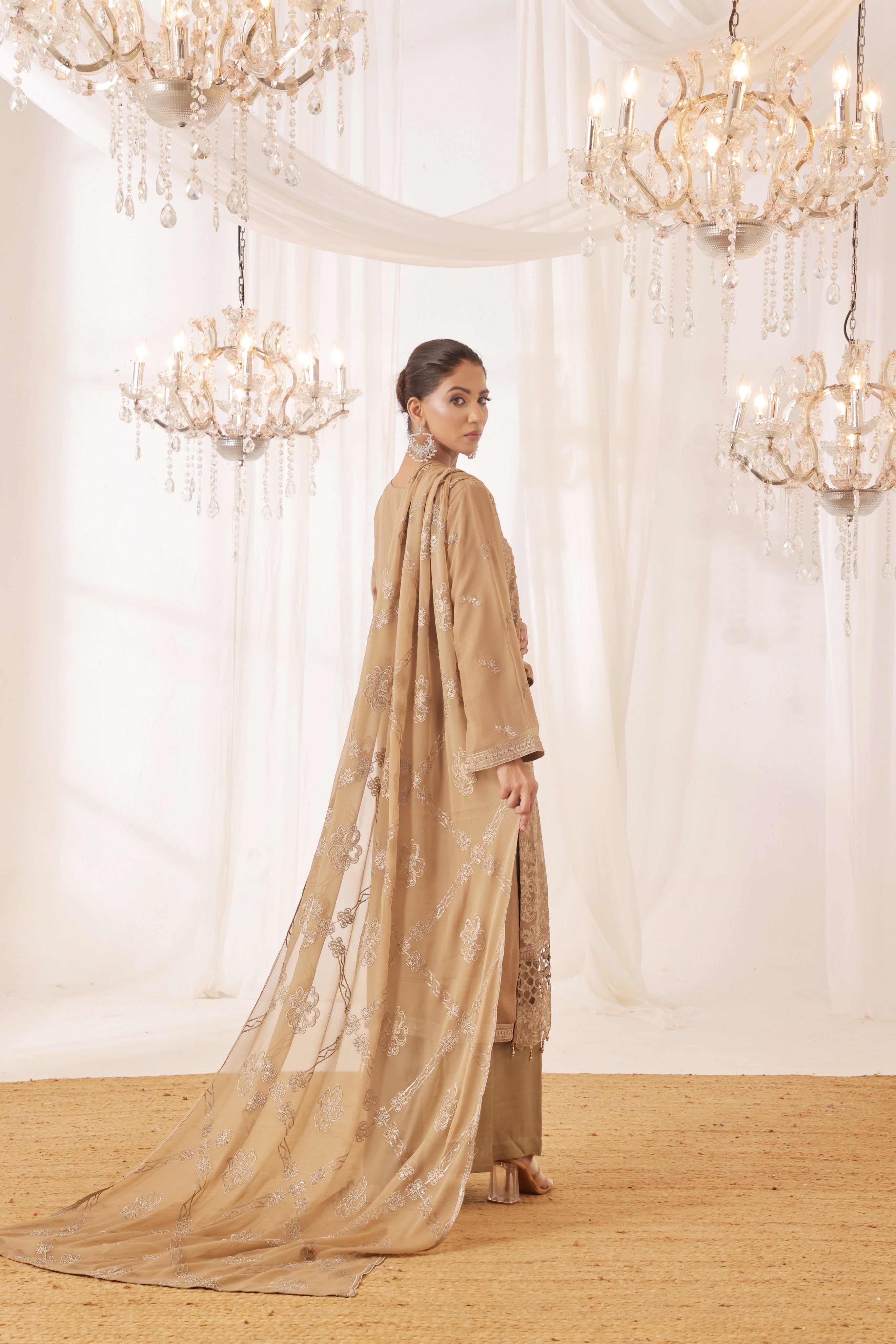 • Dupatta: An exquisitely embroidered chiffon dupatta, light yet regal, completing the ensemble with sheer sophistication.