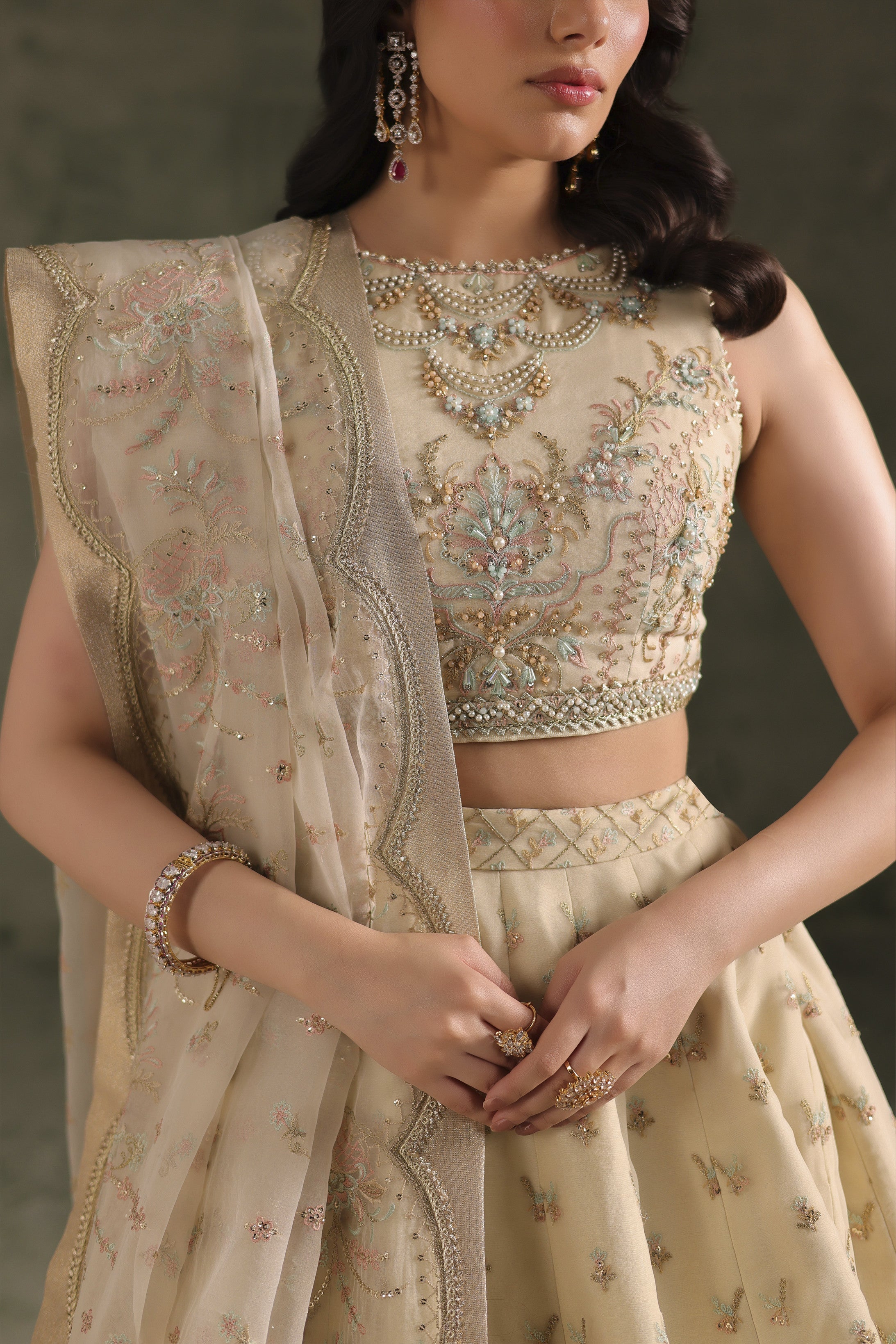 The embroidered organza bodice features exquisite hand embellishments on the front with a refined back, while hand-embellished sleeves add subtle sparkle. The lehenga, crafted with 18 embroidered organza panels, creates a voluminous and elegant silhouette.