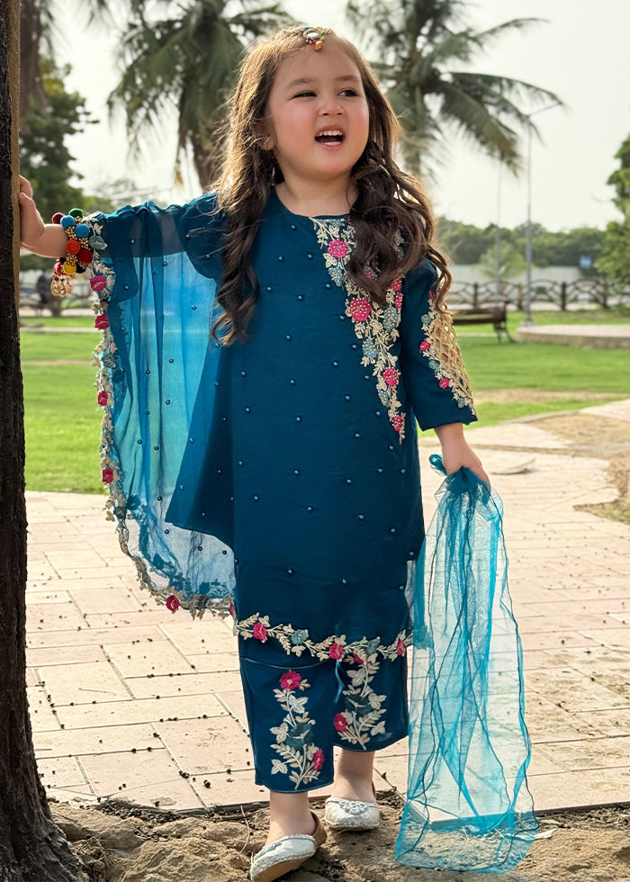Modest Stitched 3 Piece Formals Kids Collection'2025-Pearl Cape Dress - Blue