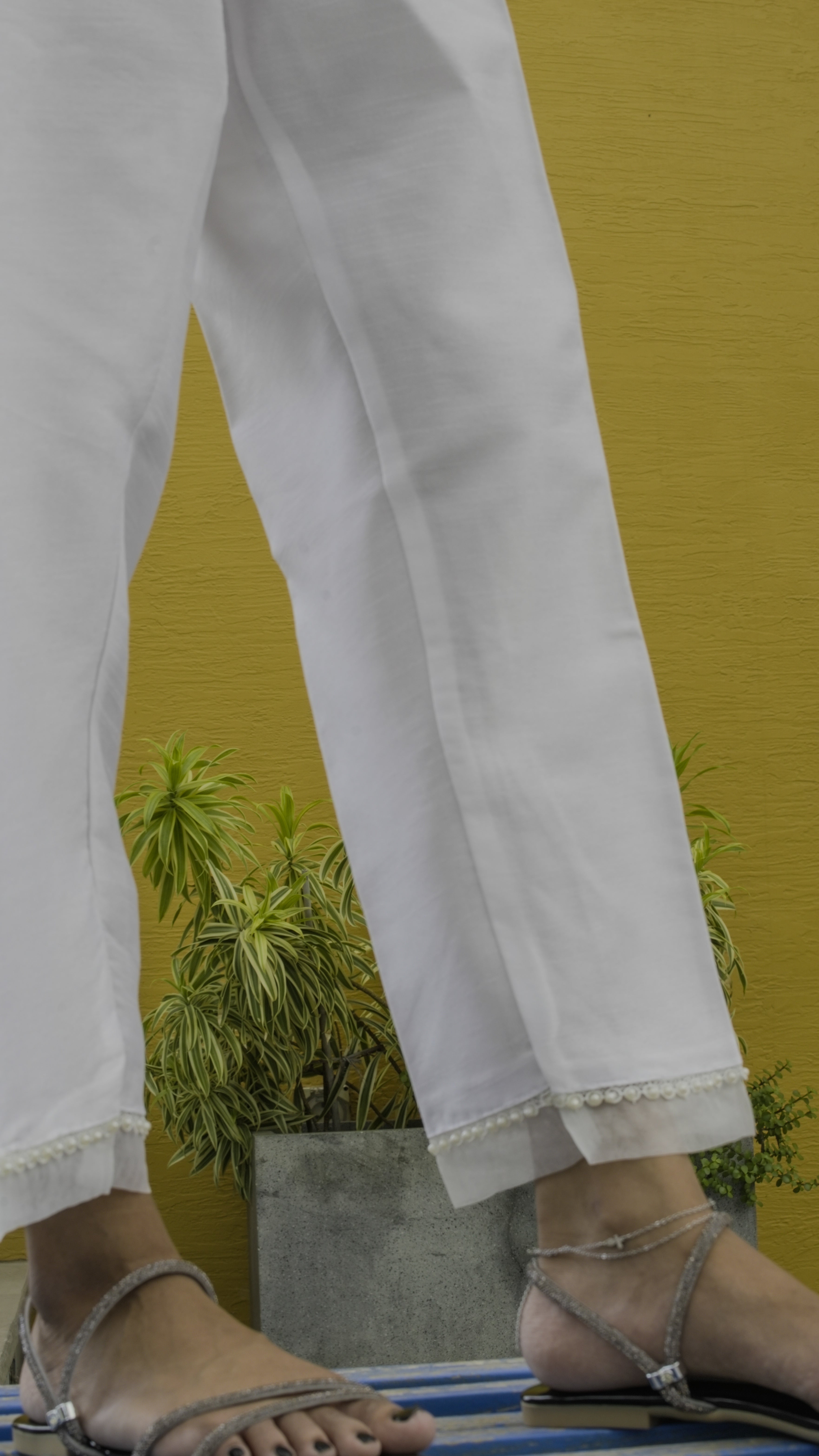 Straight-fit raw silk trousers with organza and pearl on the hems and a pocket on the right