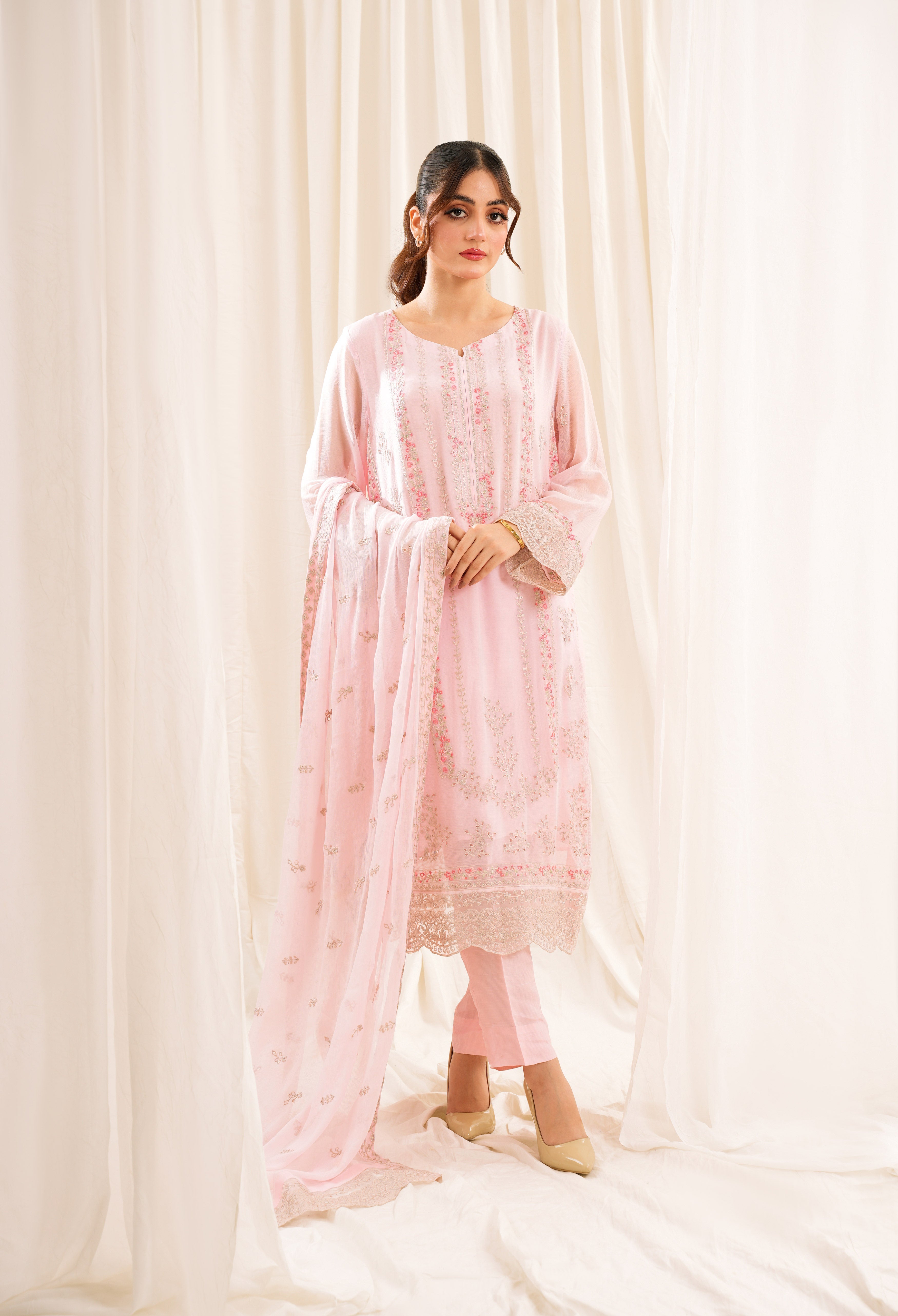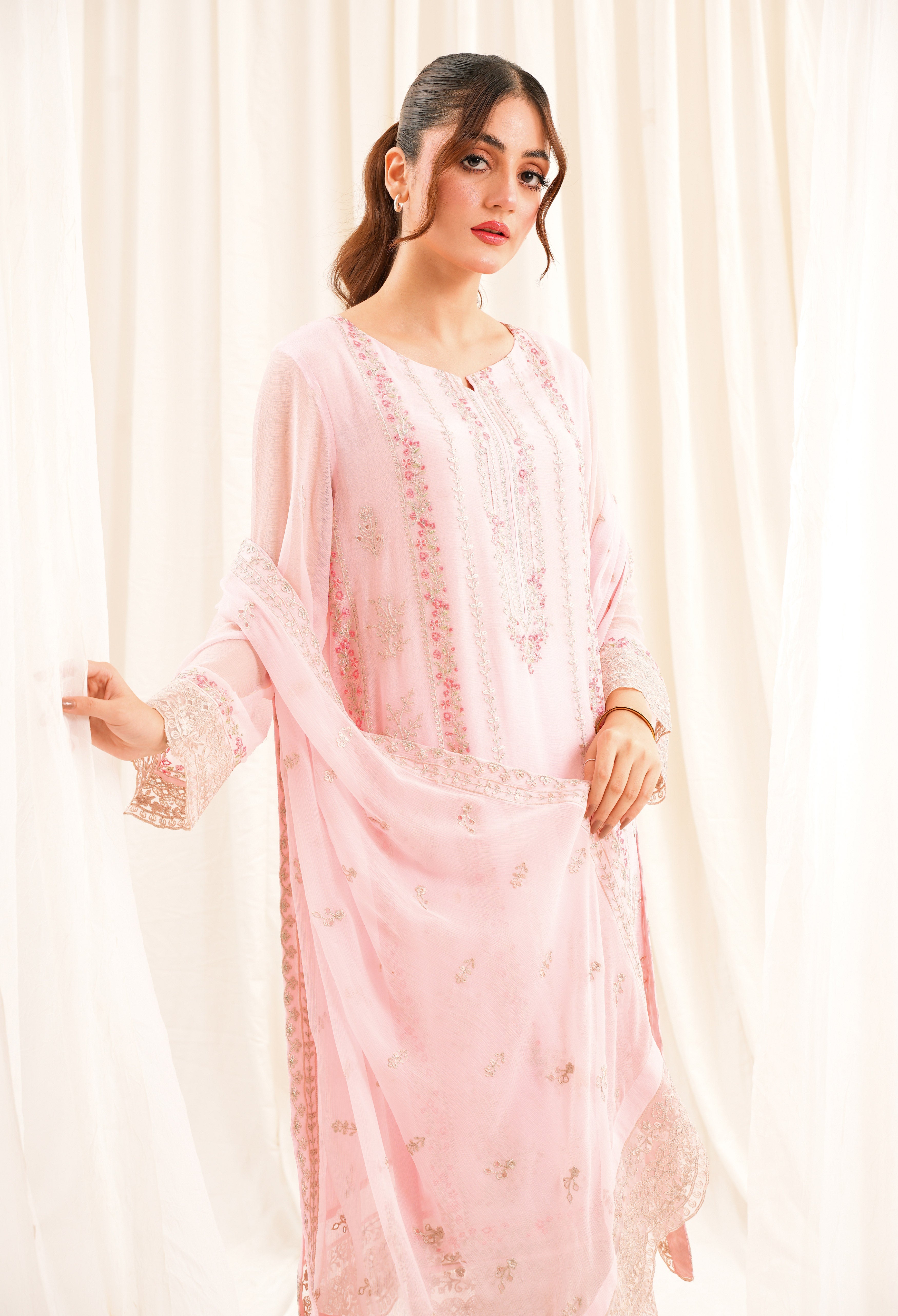 Experience luxury with our Cherry Blossom 3 piece suit made from fine chiffon and intricately embroidered. Elevate your style and stand out in any occasion.