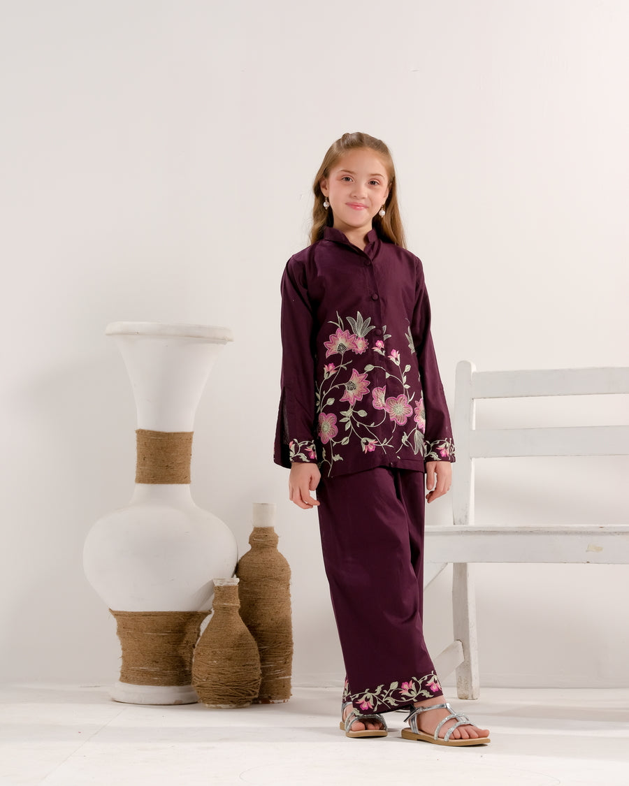 Sprinkles Stitched 2 Piece Summer Co Ord Sets Kids Collection'2025-Plum Petal Grace - 2pcs - Embroidered
