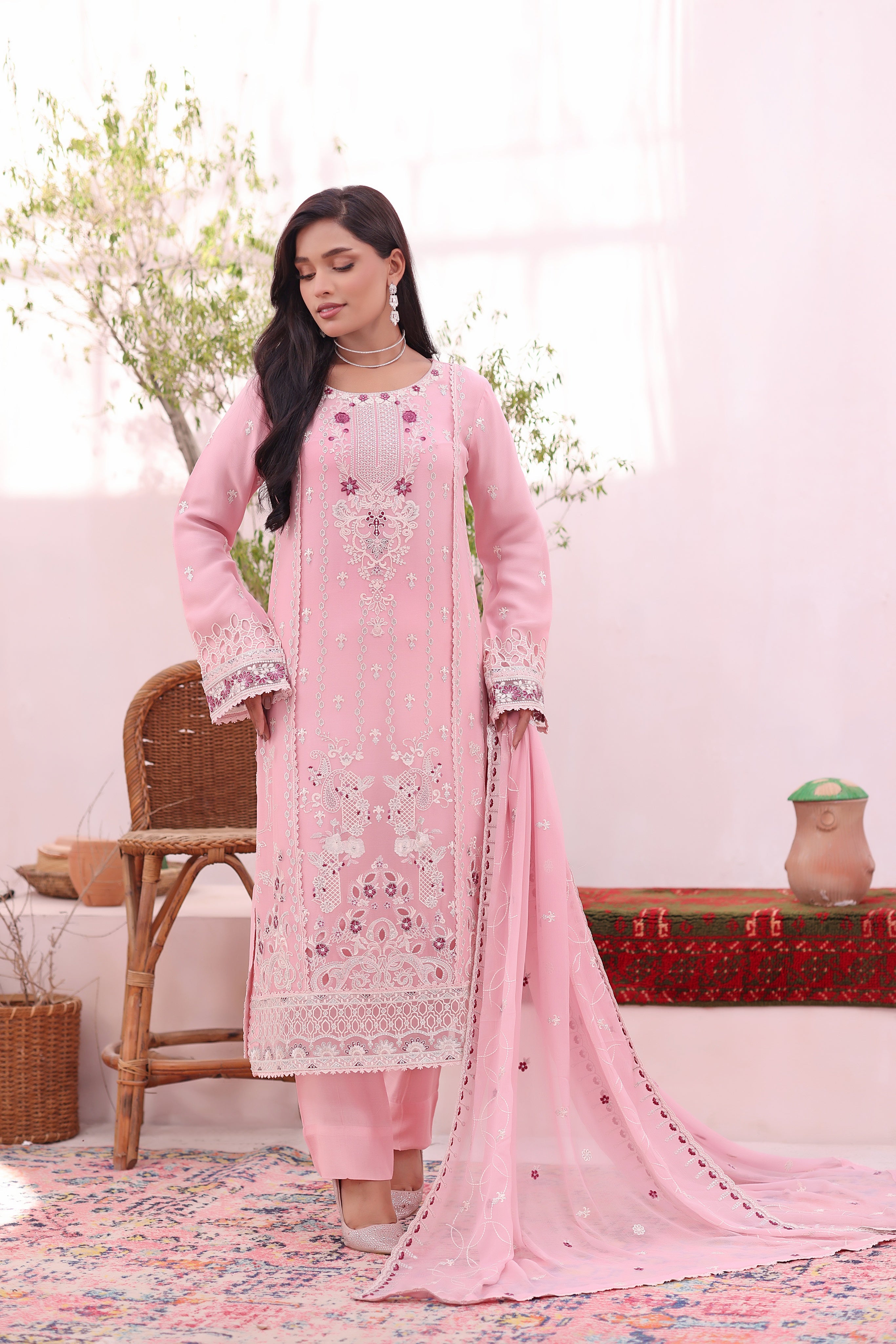 Each 3-piece set includes a ready-to-wear luxury embroidered chiffon shirt, an exquisite embroidered chiffon dupatta, and a dyed viscose trouser tailored for comfort and refinement.