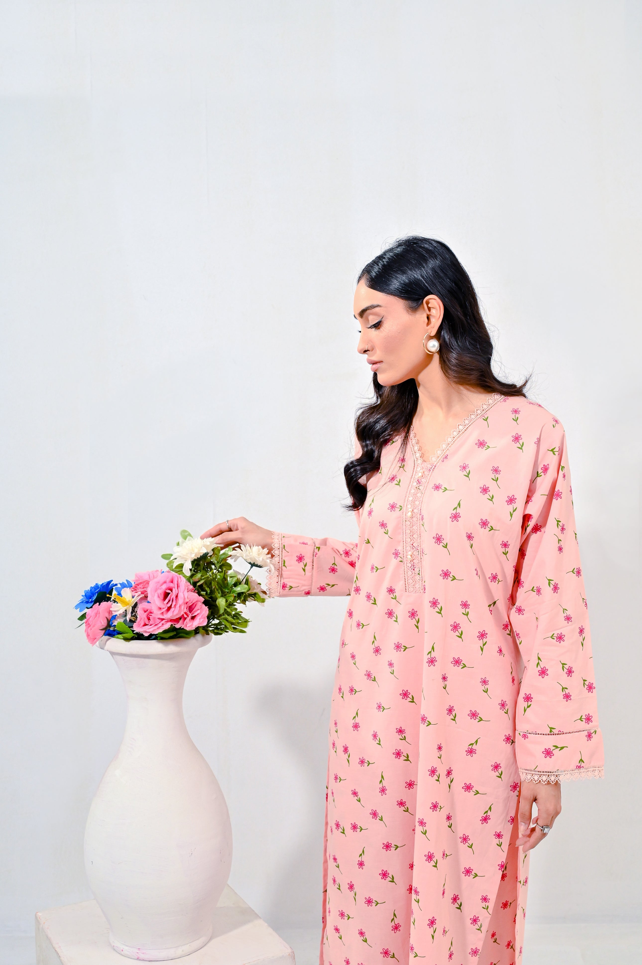 Introducing our exquisite pale pink screen printed coord set, featuring a stylish kameez paired with straight pants. The kameez showcases delicate prints that bring a feminine touch, while the straight pants provide a flattering and versatile fit. Ideal for both casual outings and festive occasions, this coord set is a perfect blend of modern aesthetics and timeless elegance.