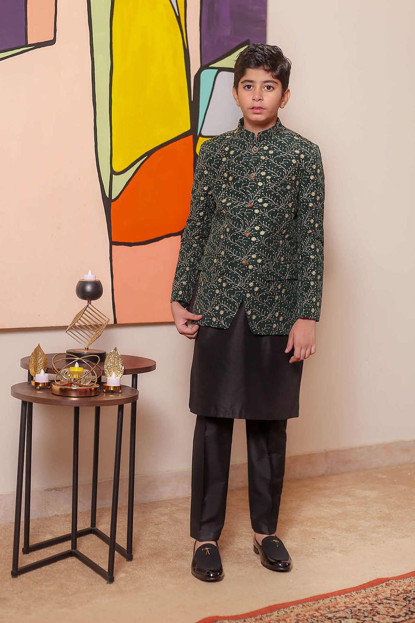 Formal Style Prince Coat for Kids , Jamawar Fabric in Green Colour with Rich Zari Embriodrey in Weaved Design , Special for Festive And Wedding Wear