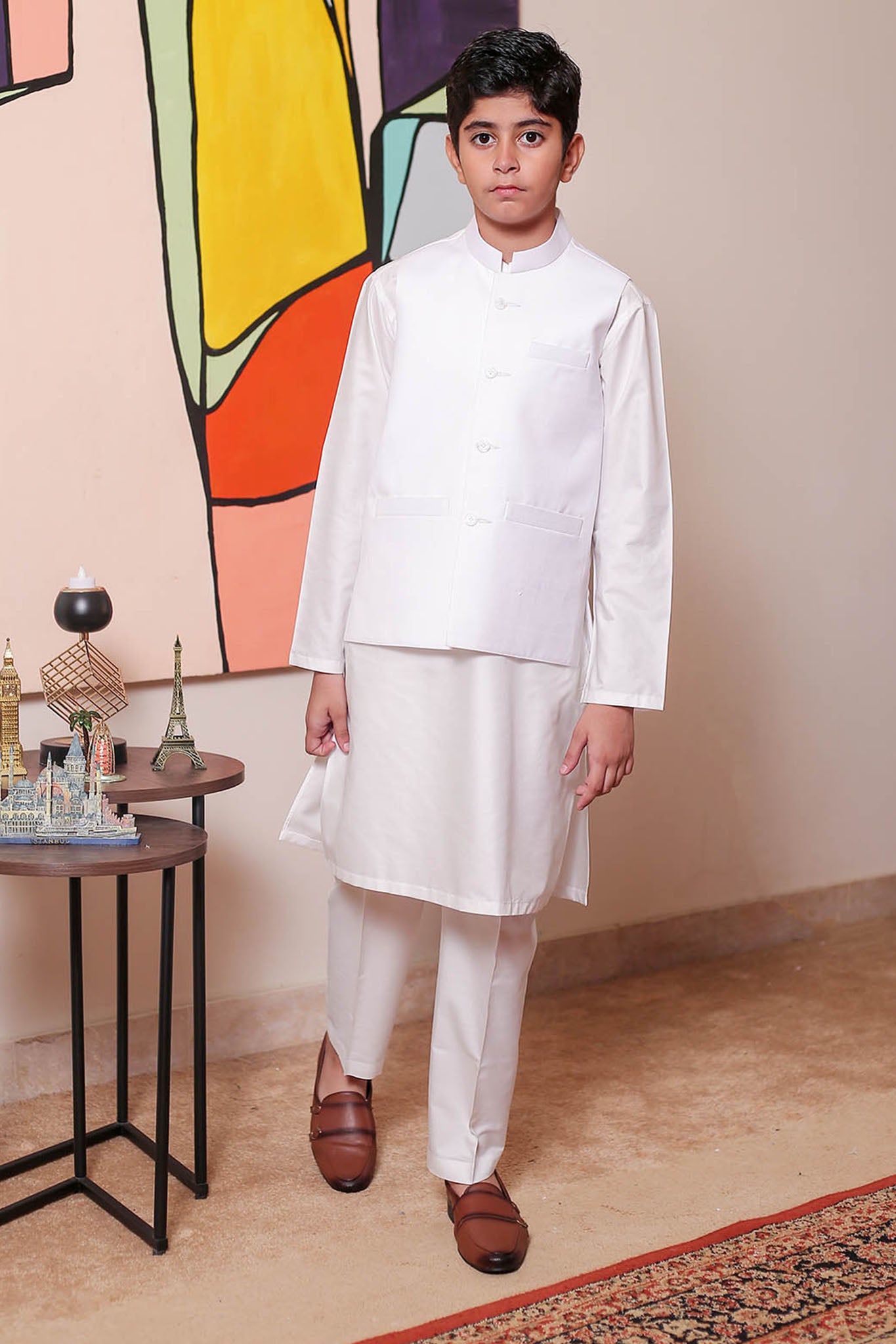 Formal Style Waist Coat for Kids , Suiting Fabric in White Colour with Rich Weaved Design , Special for Festive And Wedding Wear