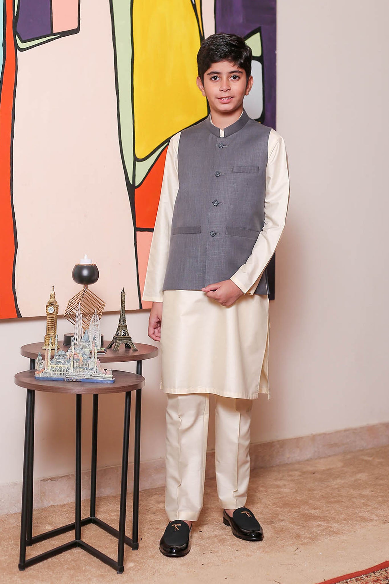 Formal Style Waist Coat for Kids , Suiting Fabric in Light Grey Colour with Rich Weaved Design , Special for Festive And Wedding Wear