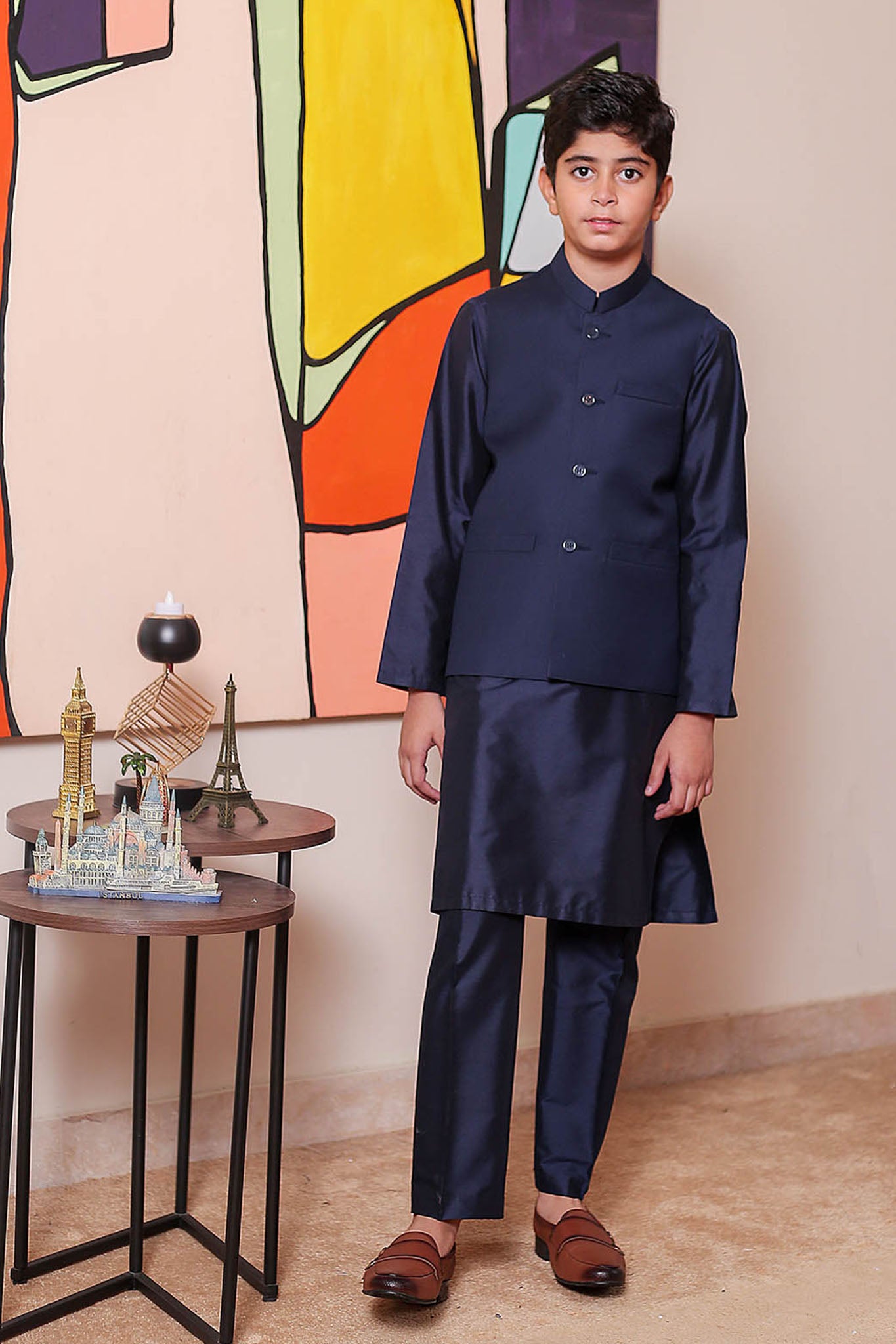 Formal Style Waist Coat for Kids , Suiting Fabric in Blue Colour with Rich Weaved Design , Special for Festive And Wedding Wear