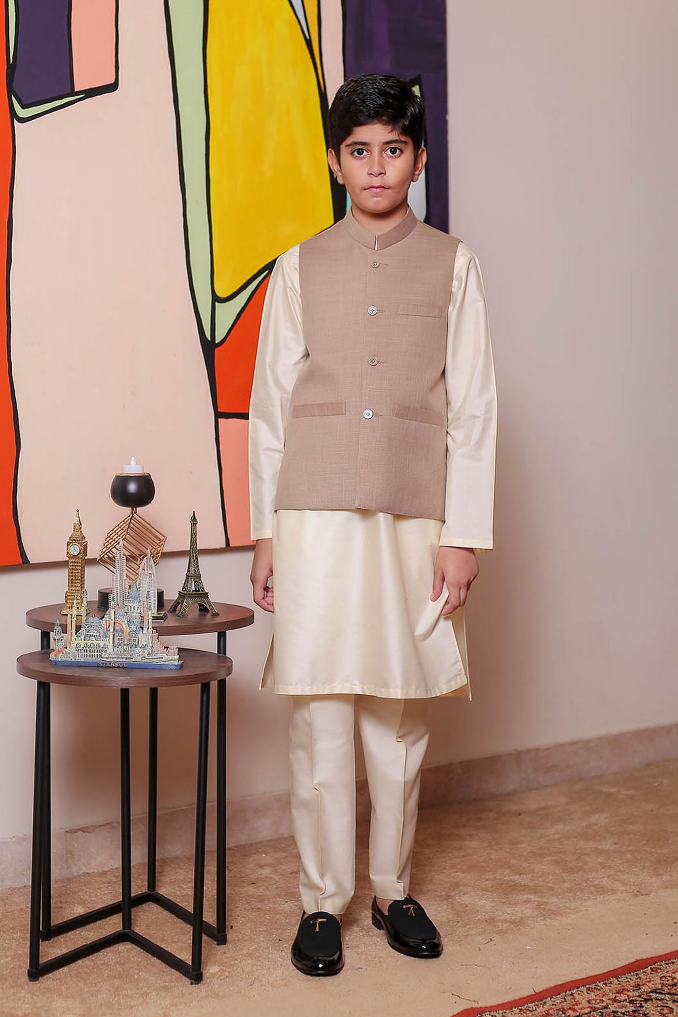 Formal Style Waist Coat for Kids , Suiting Fabric in Beige Colour with Rich Weaved Design , Special for Festive And Wedding Wear