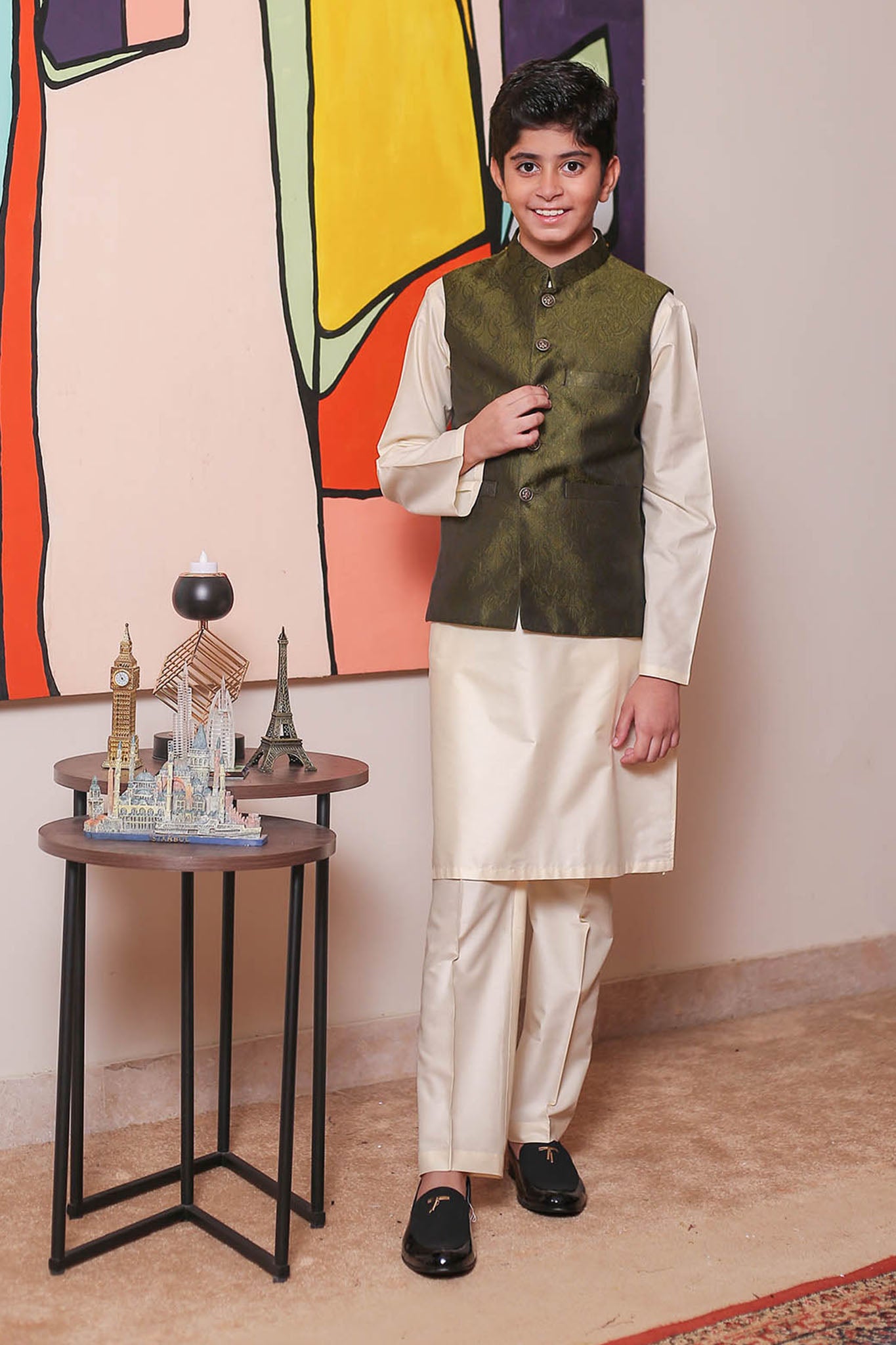 Formal Style Waist Coat for Kids , Jamawar Fabric in Green Colour with Rich Weaved Design , Special for Festive And Wedding Wear
