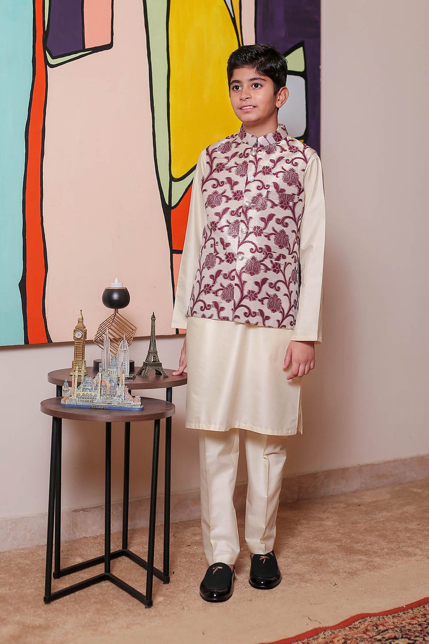 Formal Style Waist Coat for Kids , Jamawar Fabric in Cream Colour with Maroon and Rich Zari in Weaved Design , Special for Festive And Wedding Wear