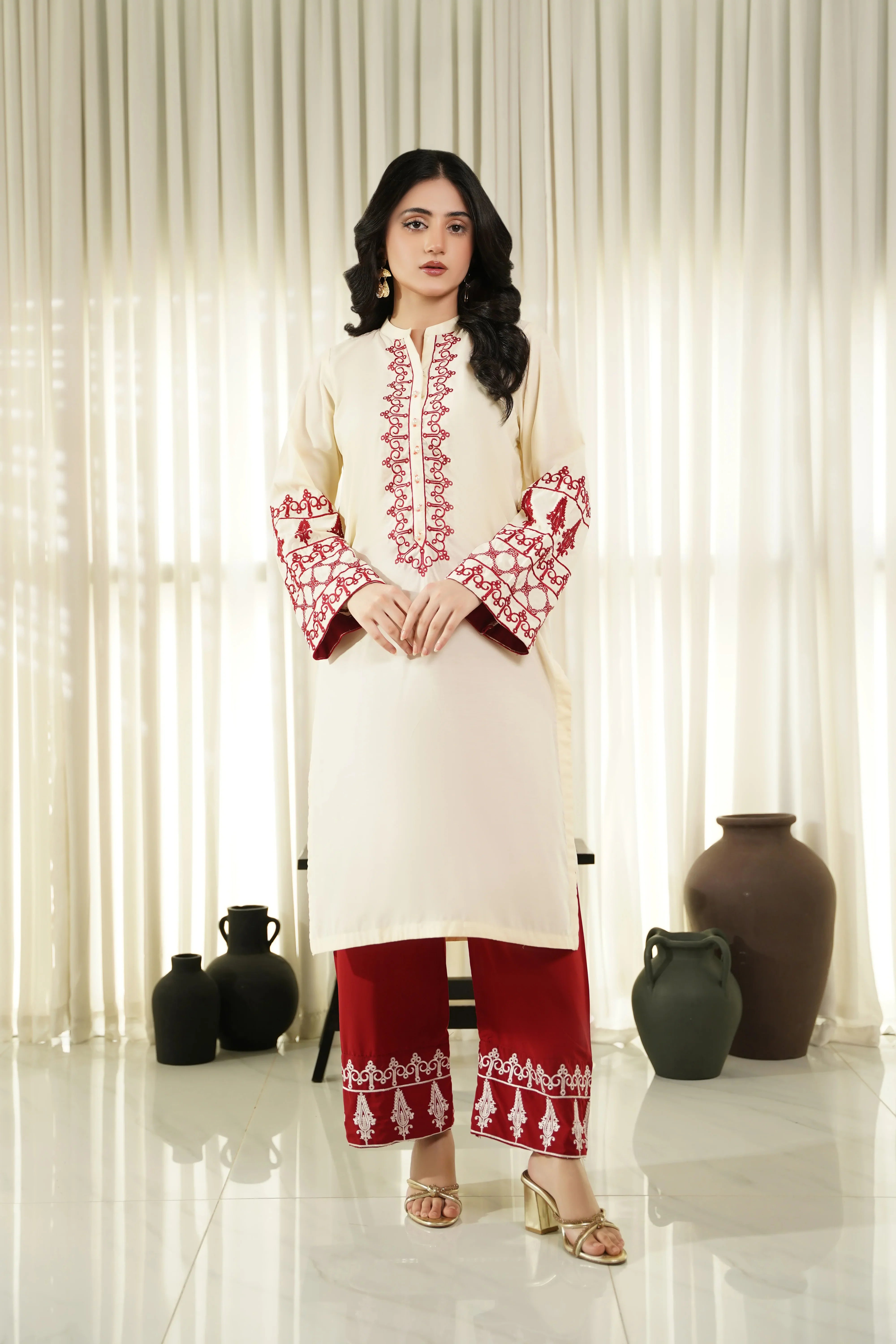 This article consists of a solid 2-piece set with an intricate embroidery detail touch on the shirt. The outfit consists of a long-length style shirt and fitted pants.