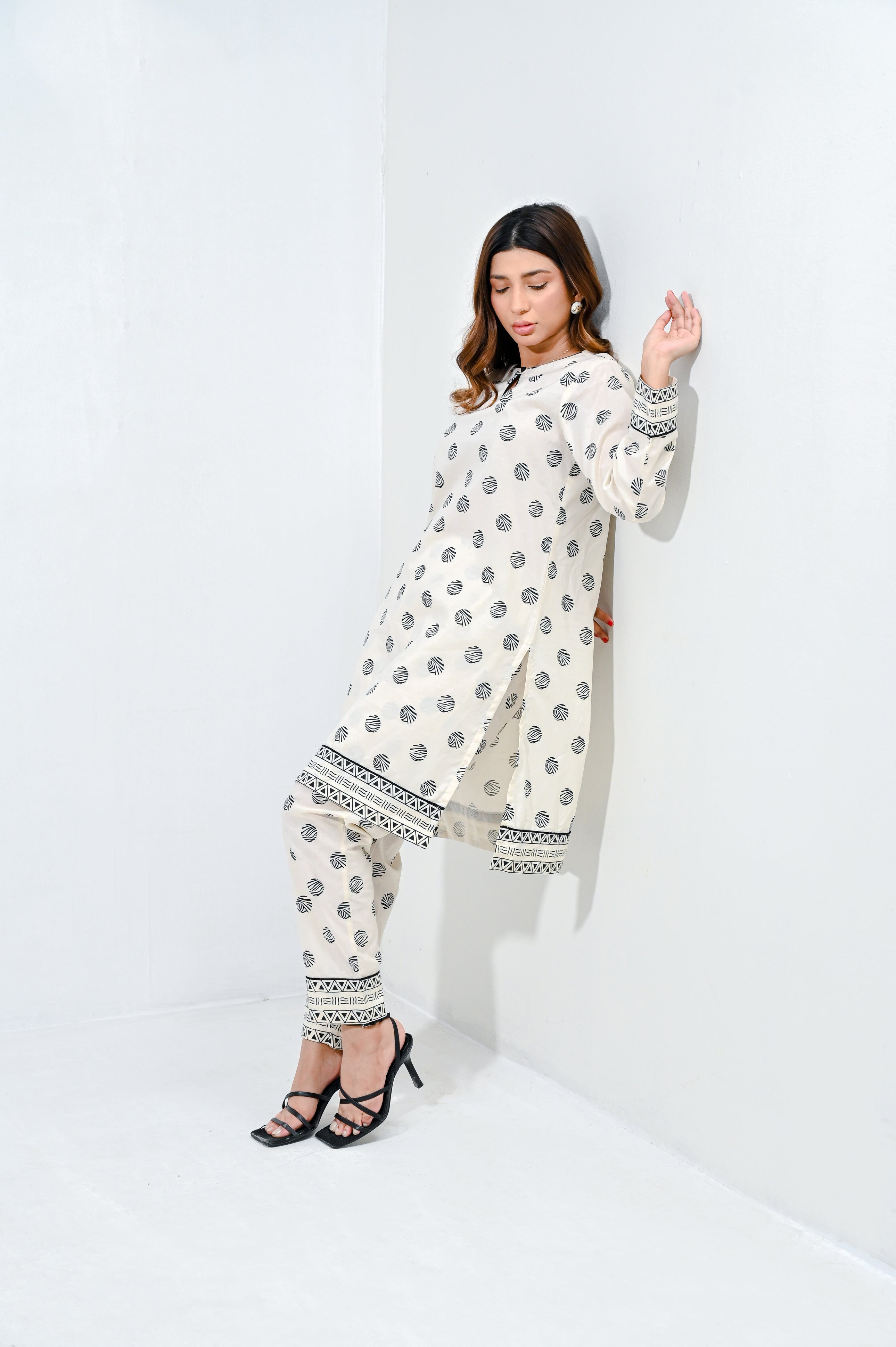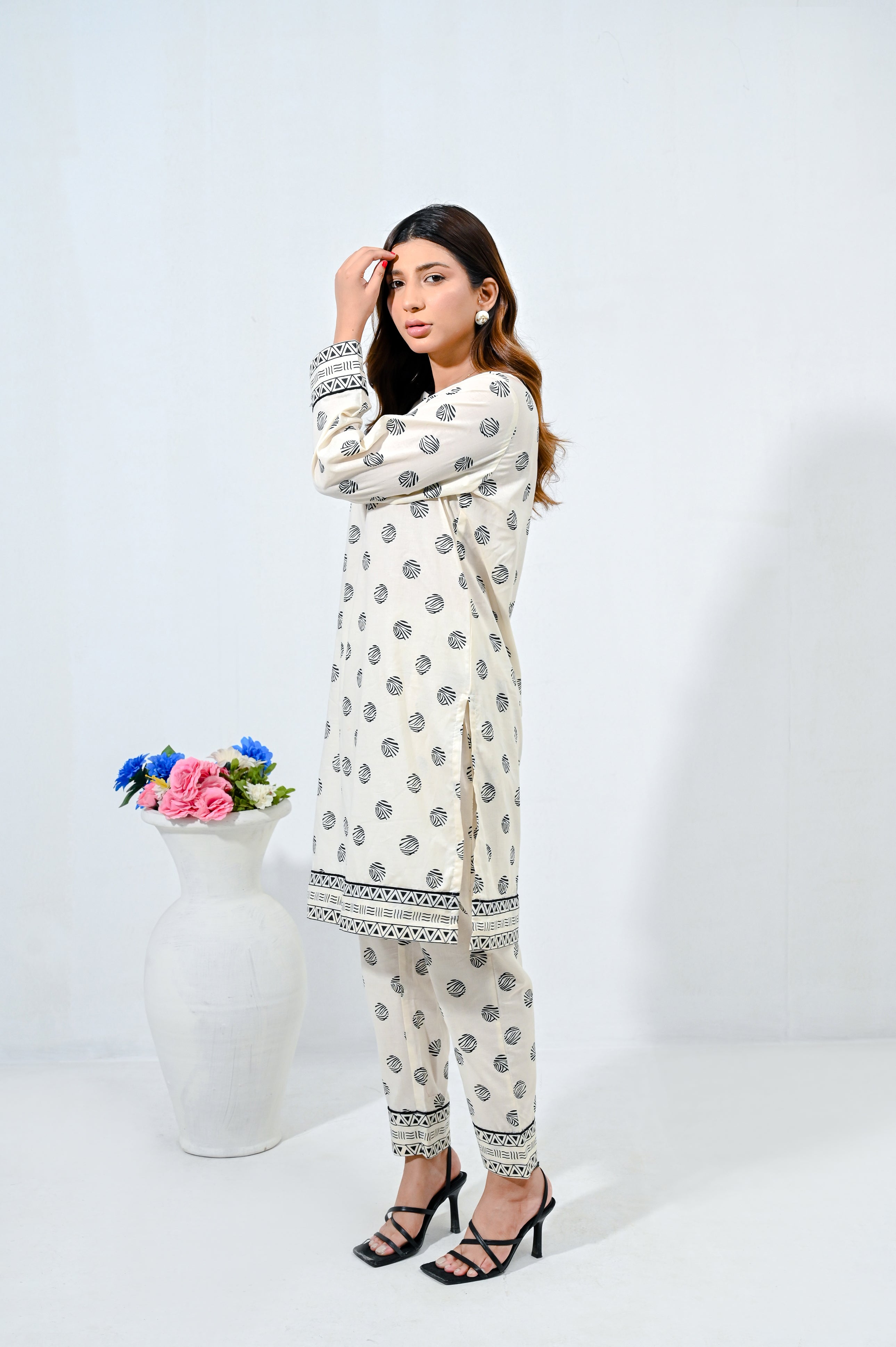 Embrace effortless chic with this stunning white cambric screen printed shirt and matching printed straight pants coord set. The shirt boasts delicate prints that add a touch of sophistication, while the straight pants offer a contemporary silhouette for a flattering fit. This versatile ensemble can be dressed up with heels or kept laid-back with flats.