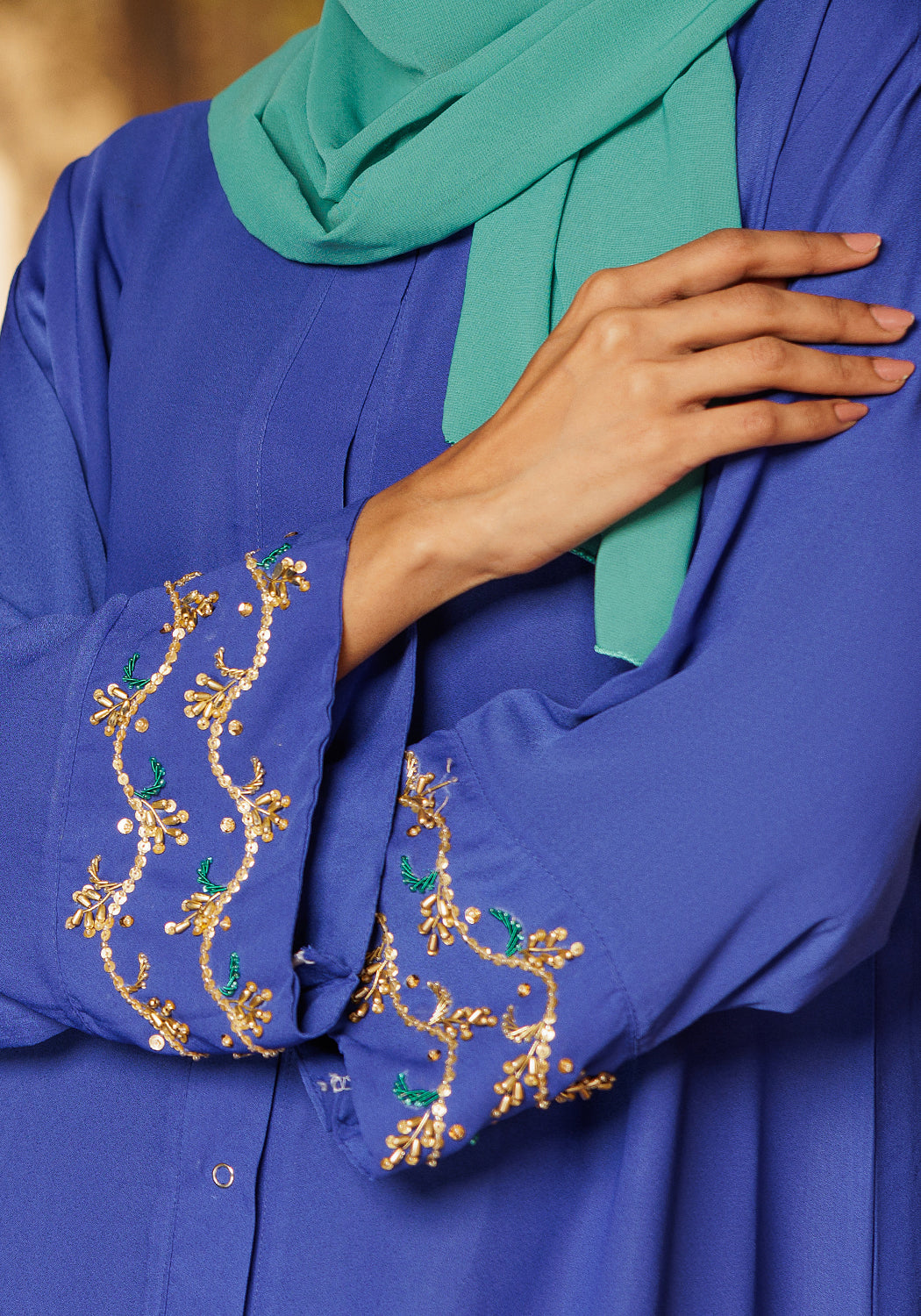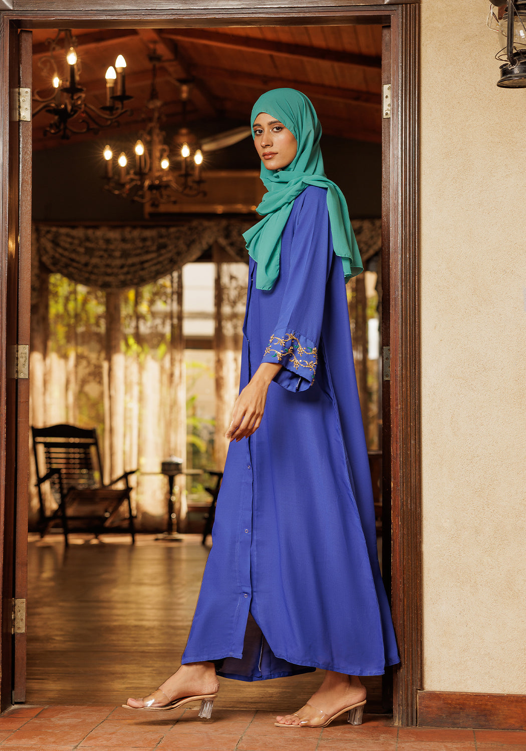 Elevate your style with this royal blue outfit, adorned with exquisite handwork detailing on the cuffs in gold and green. The intricate craftsmanship adds a luxurious touch, making it ideal for special occasions or graceful everyday wear. Comfortable and timeless, it's a must-have for your wardrobe.