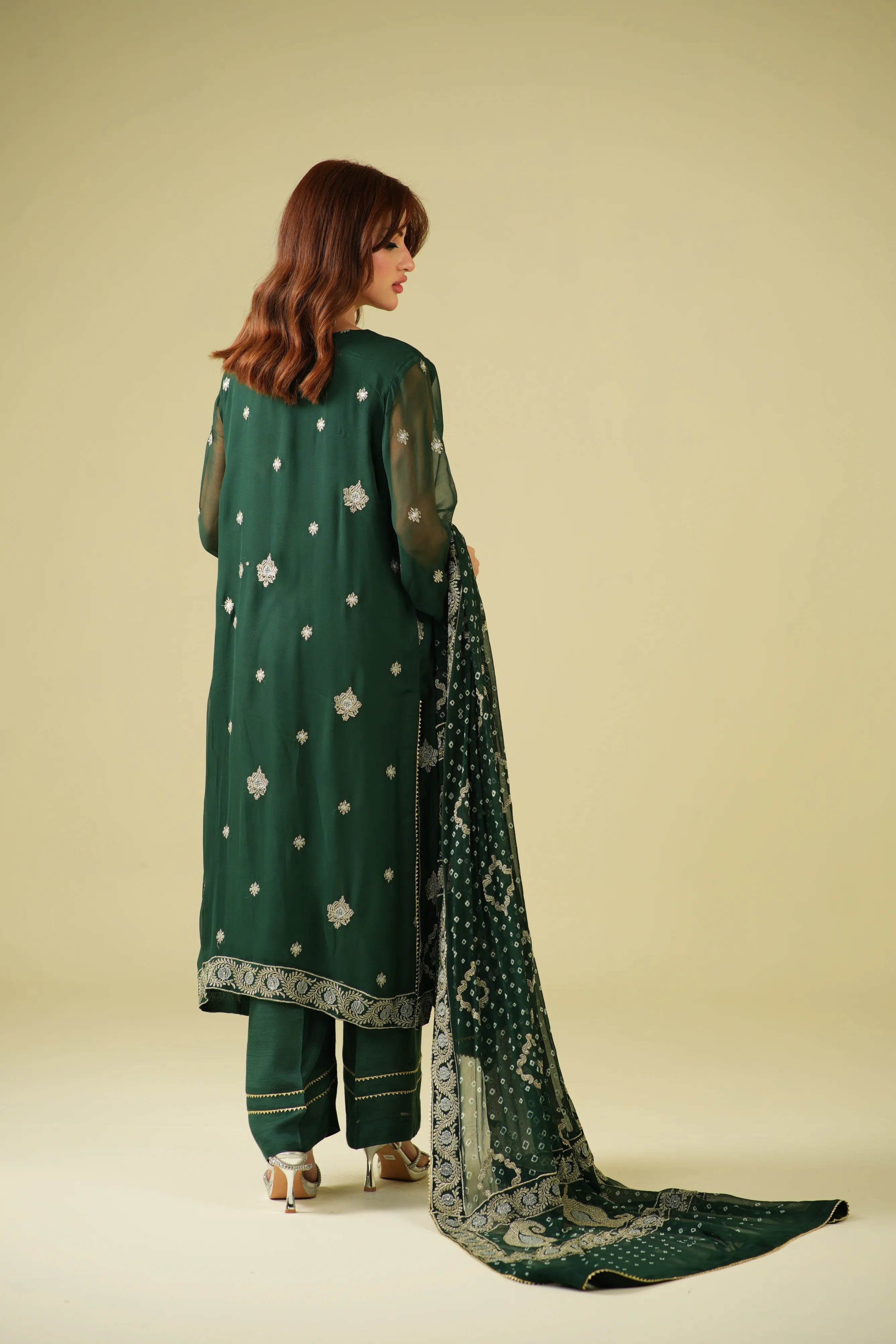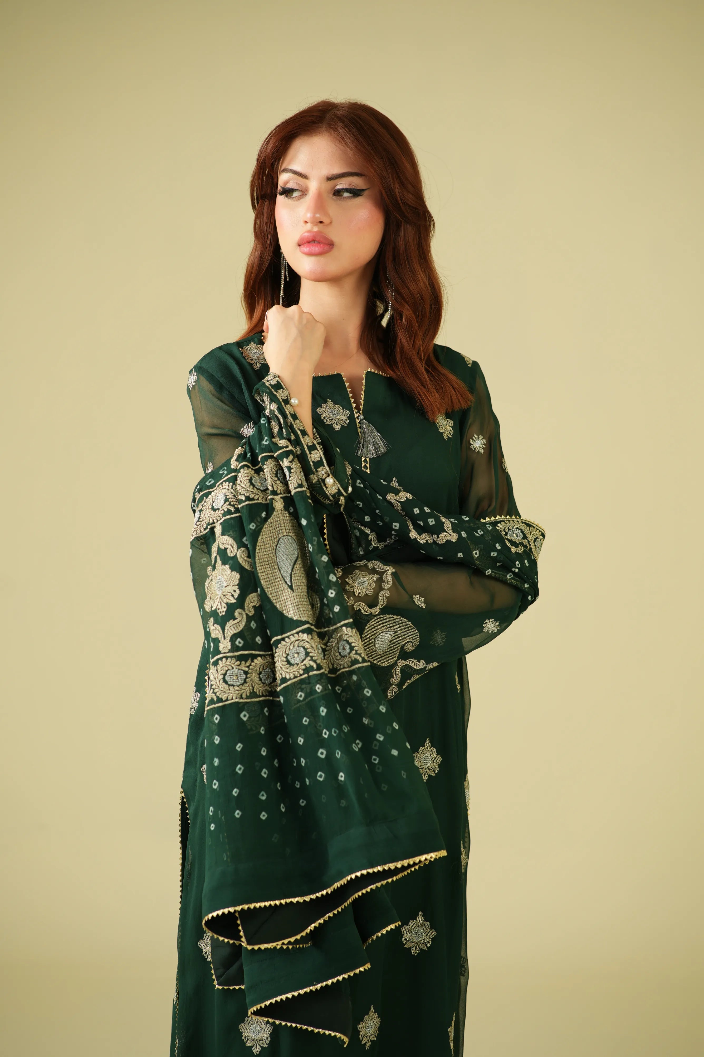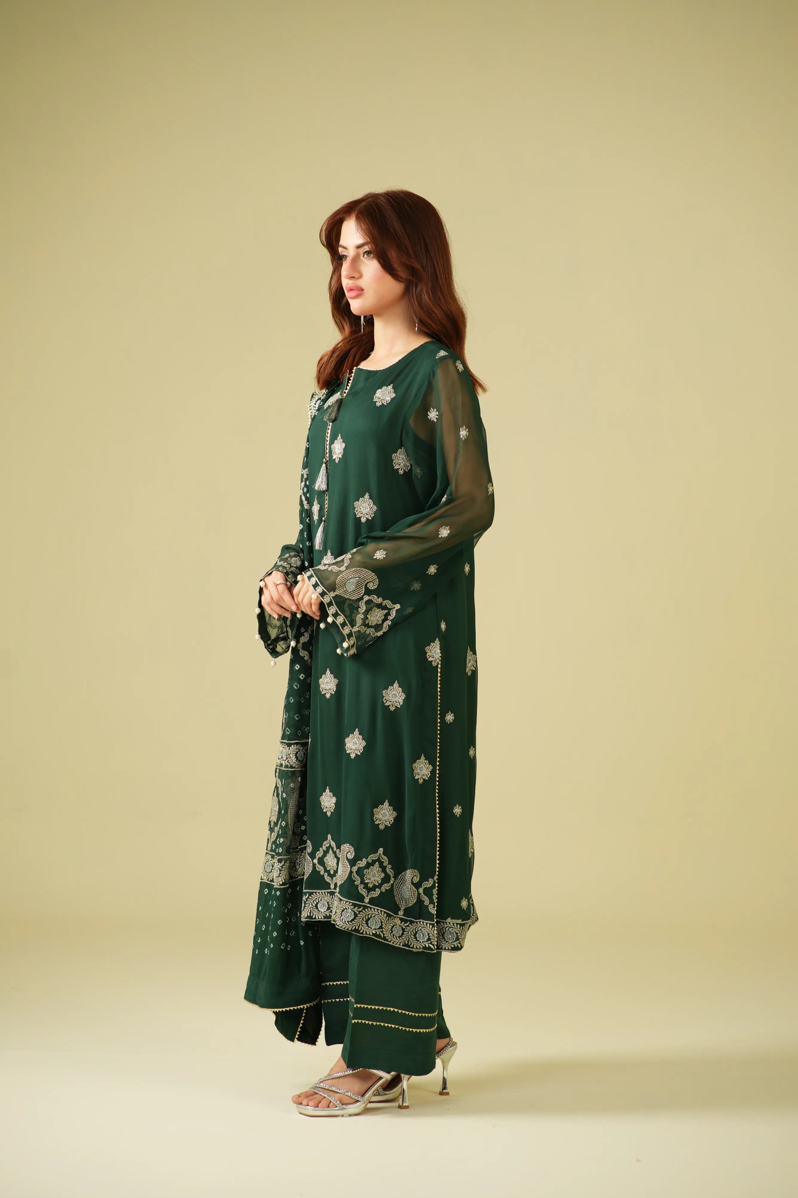 Indulge in refined elegance with this premium 3-piece unstitched chiffon ensemble from the Satrang Chunri Collection. Featuring delicate embroidery on the front, back, and sleeves, paired with a handmade embroidered Chunri dupatta, this design embodies timeless sophistication. Finished with a plain dyed trouser and inner, it?s the perfect choice for festive and formal occasions.