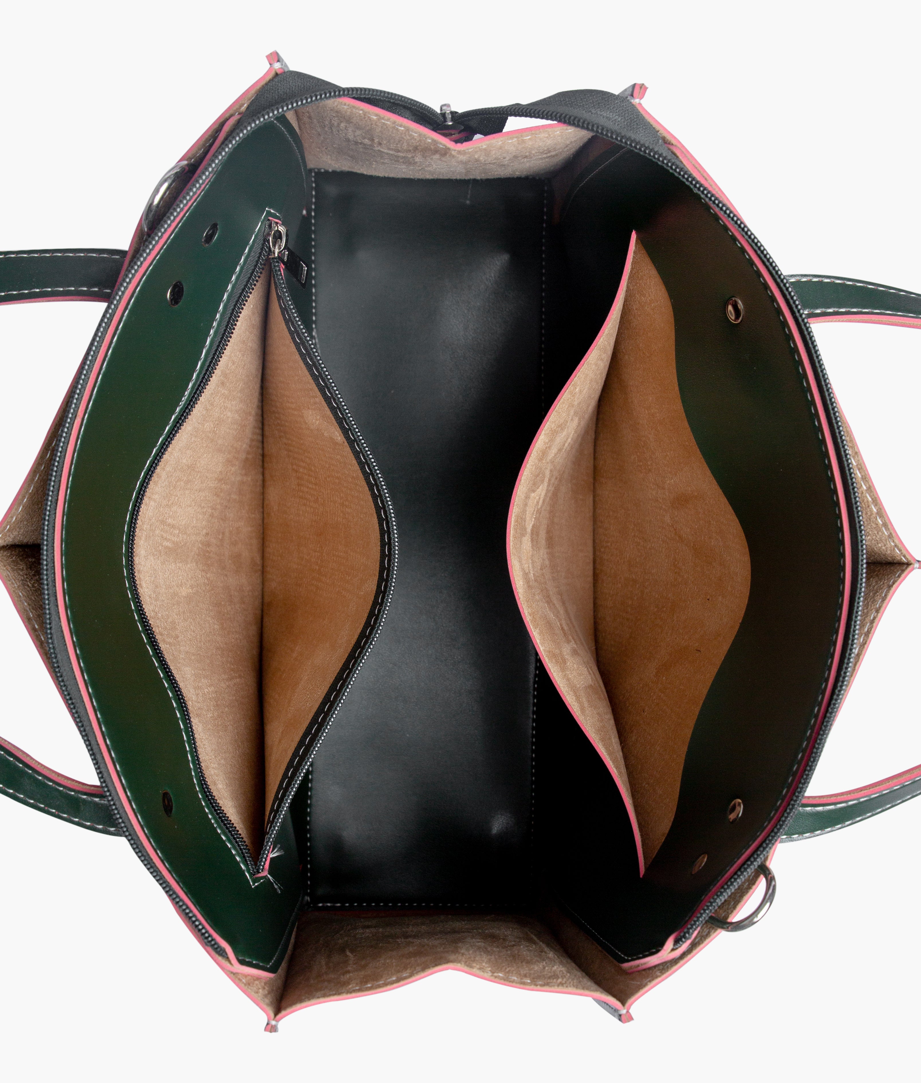 • One main zipper compartment, one pocket with zipper and one slide pocket inside.