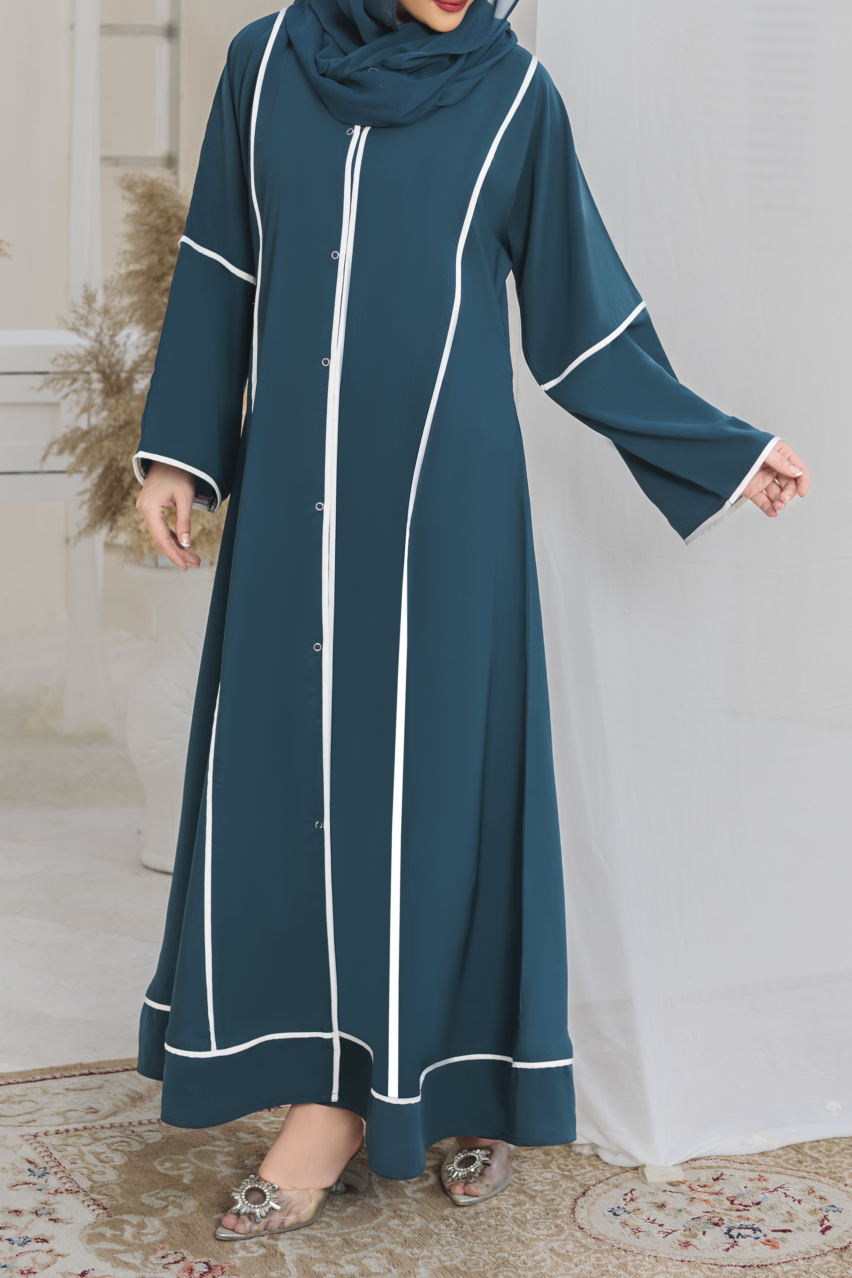 This is a must for your wardrobe collection with our new latest colors which is breathtaking and ultimately gorgeous with pipin on front all over making it our hot sellers these days front open style abaya come along with pure Korean digital chiffon Sheila