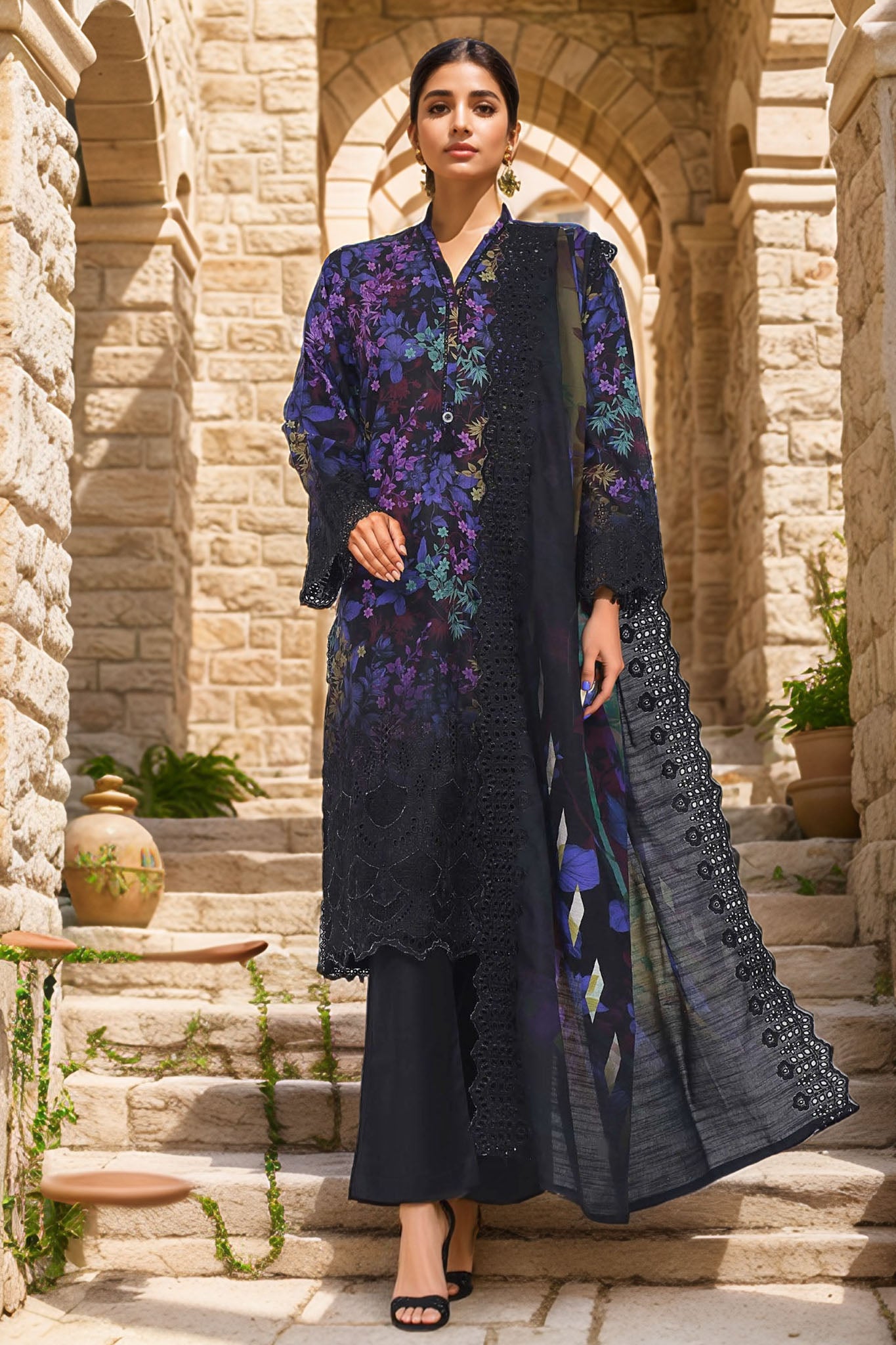 • Stitched 3 Piece Laser Cutwork Chikankari Khaddar Suit