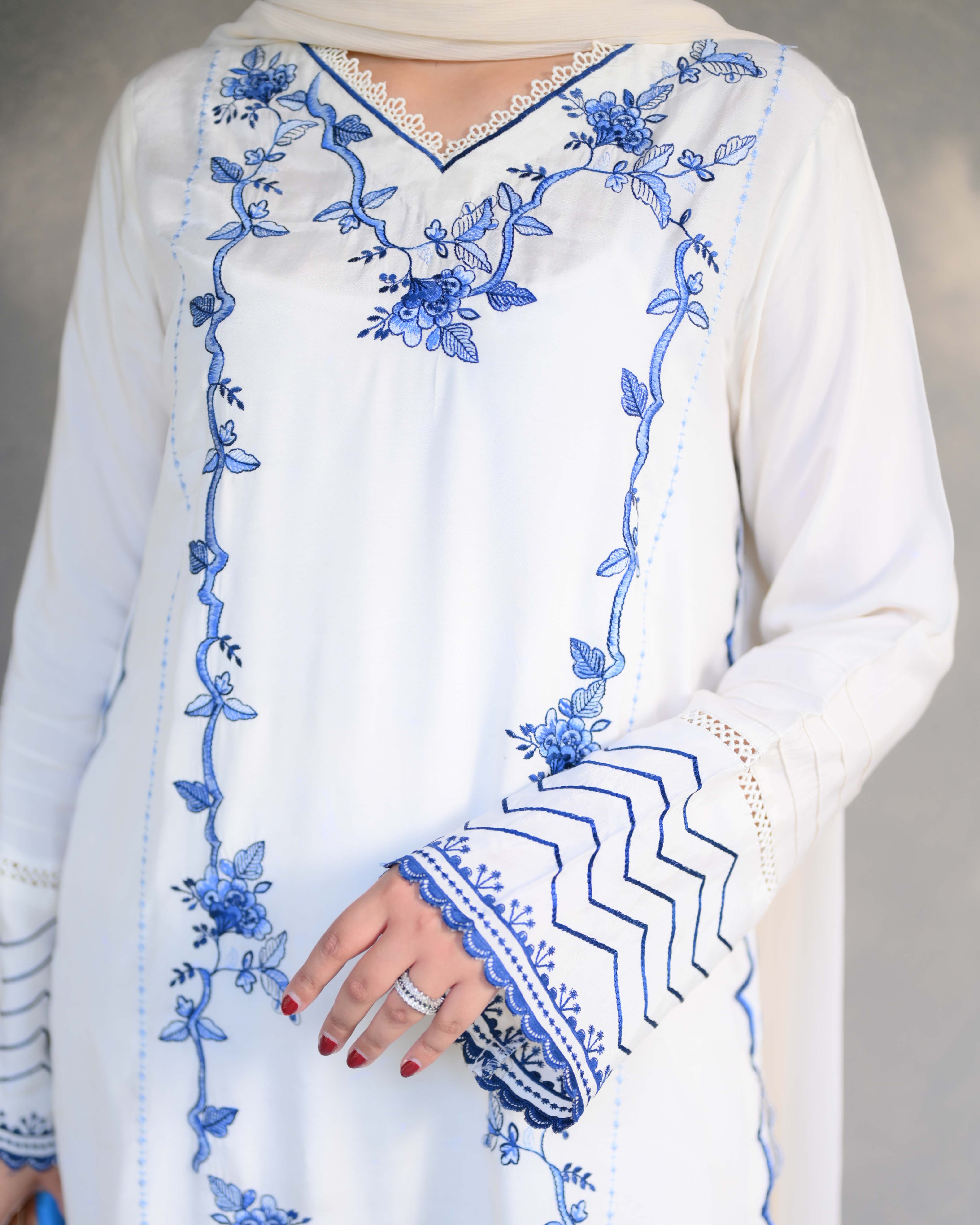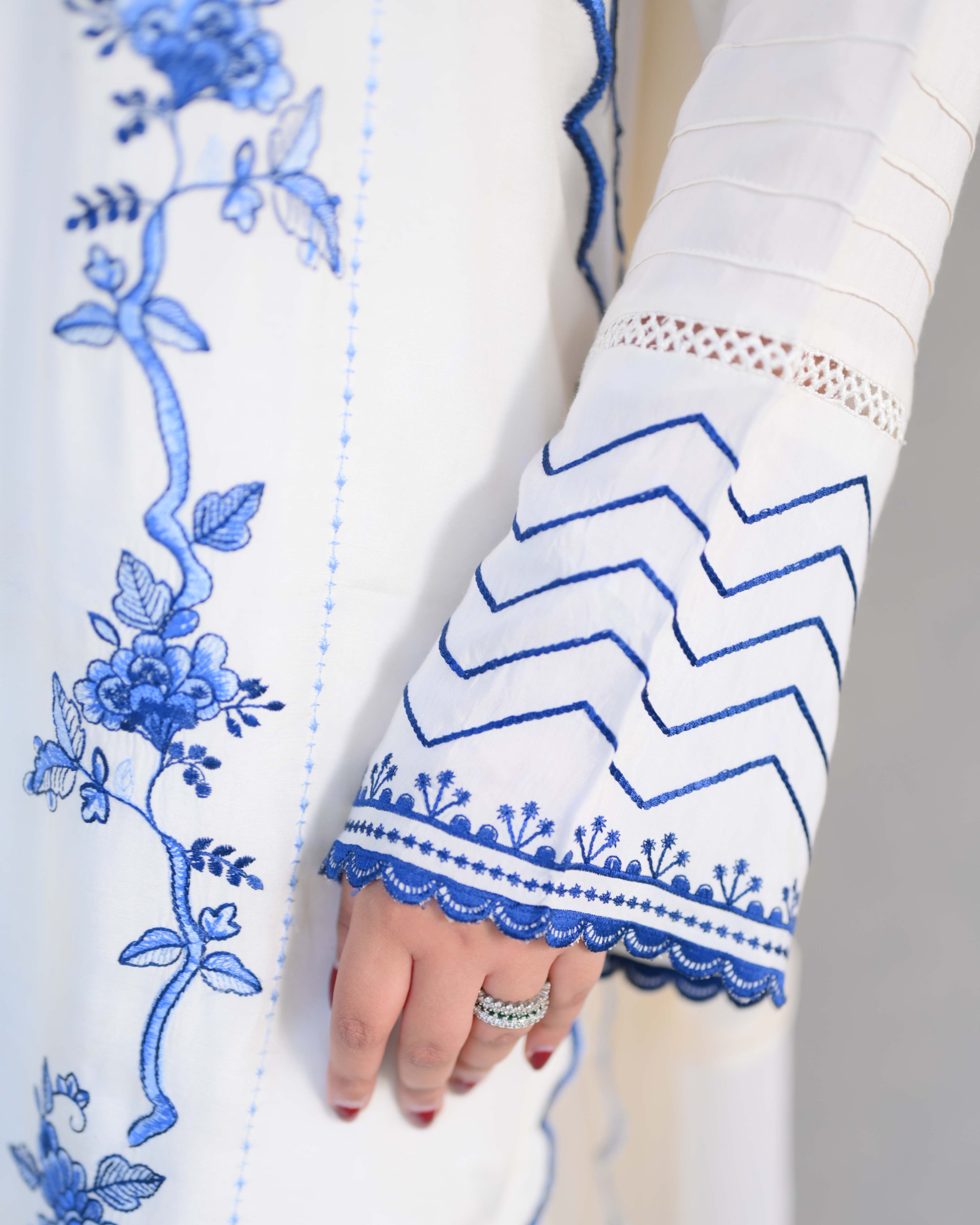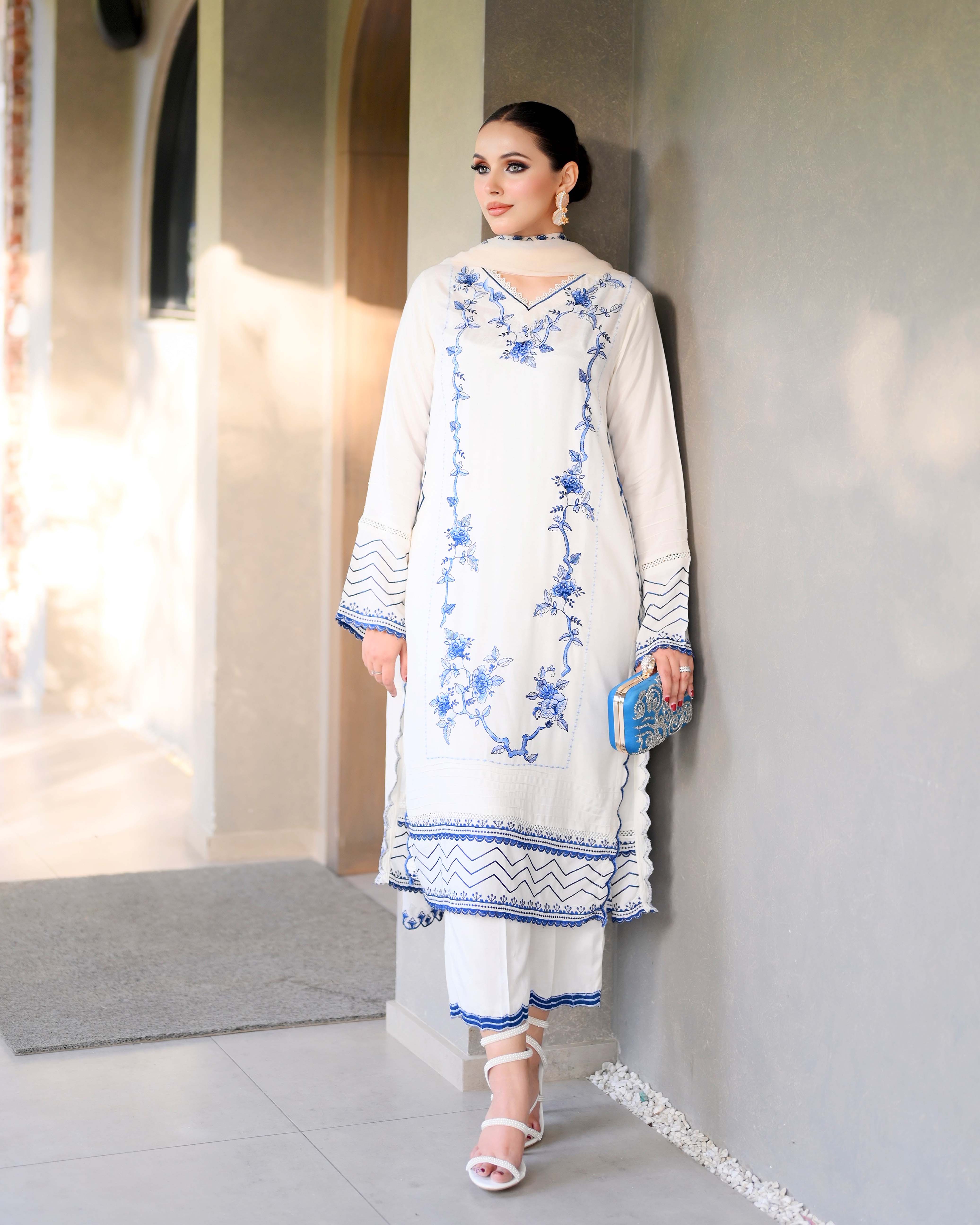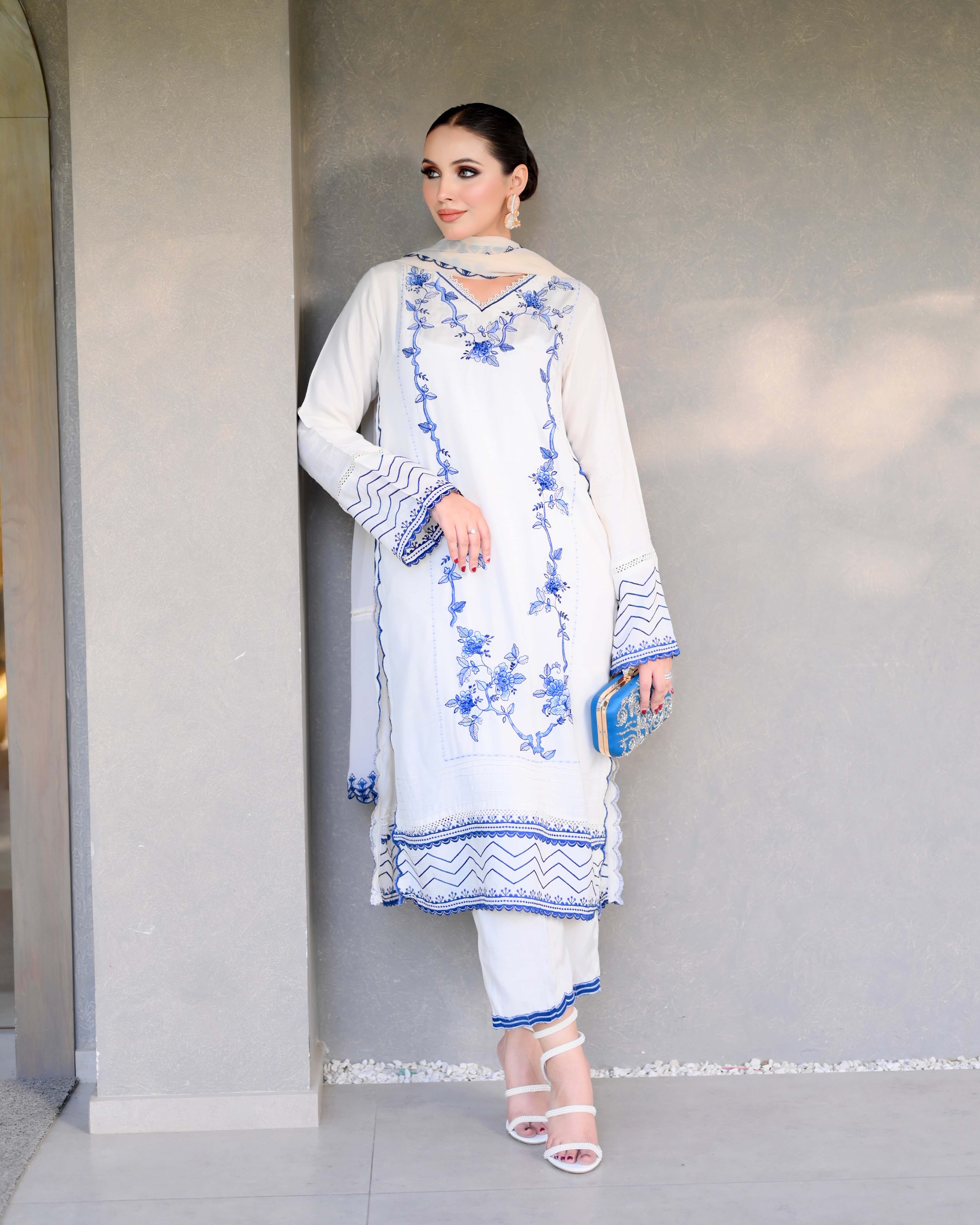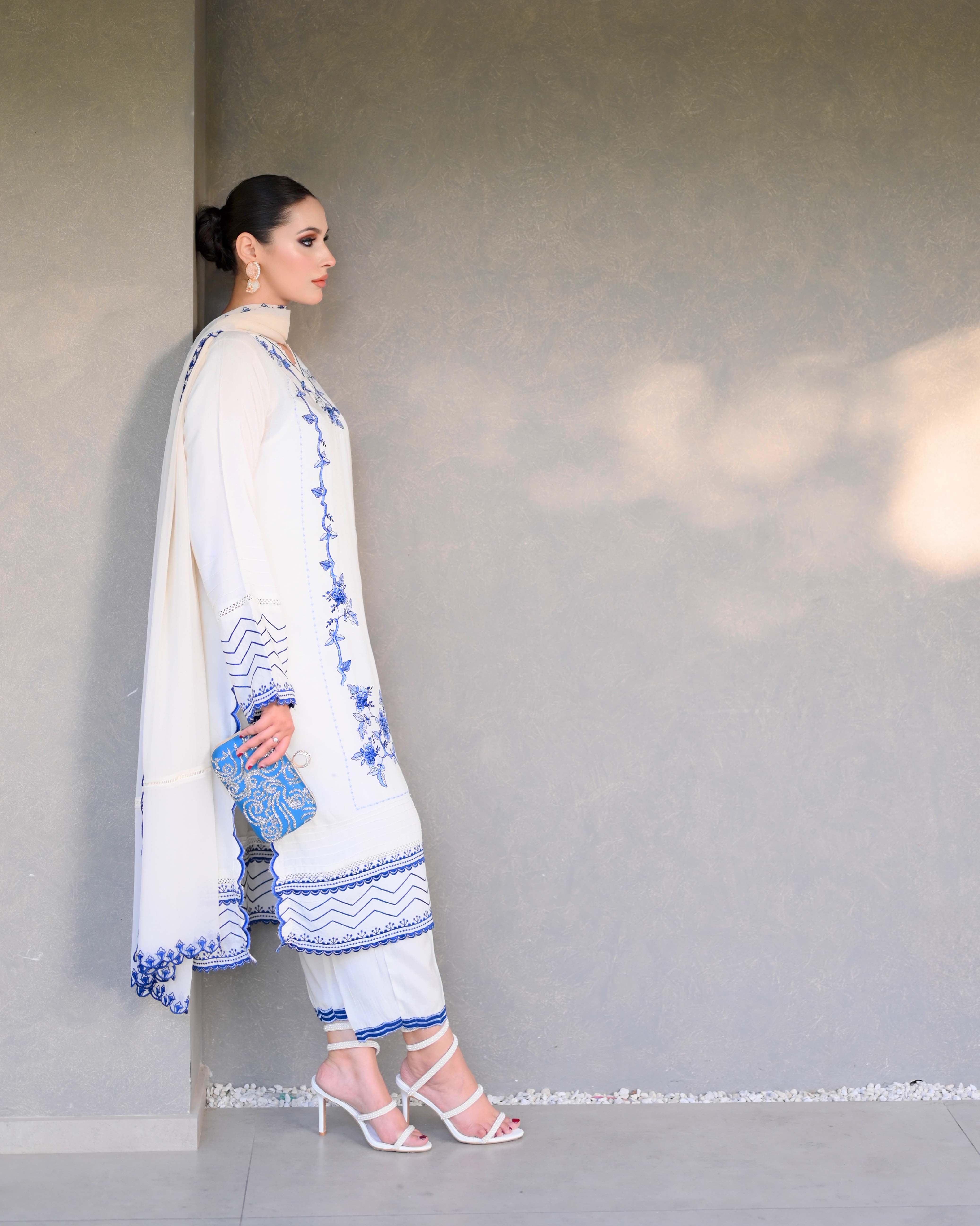 Selene is a 3-piece embroidered ensemble in a serene off-white hue, designed for those who appreciate refined details.