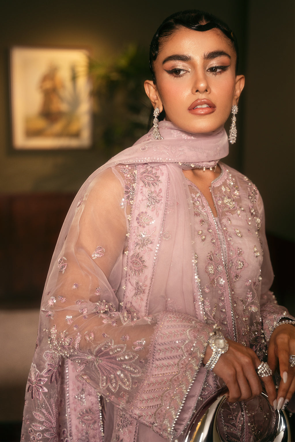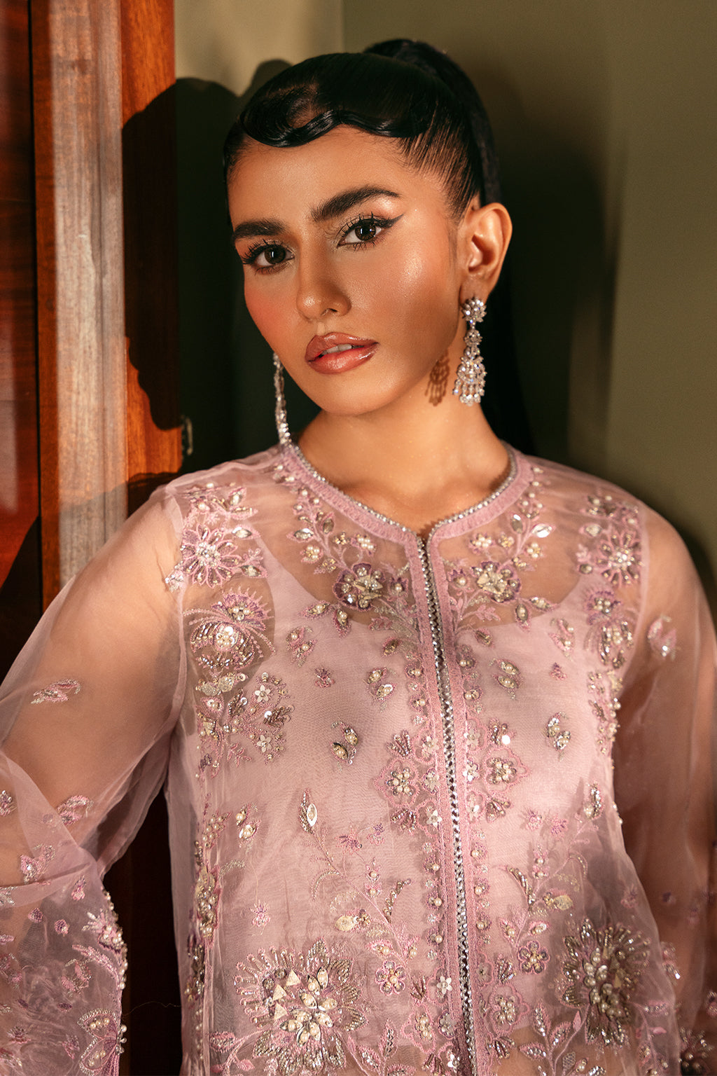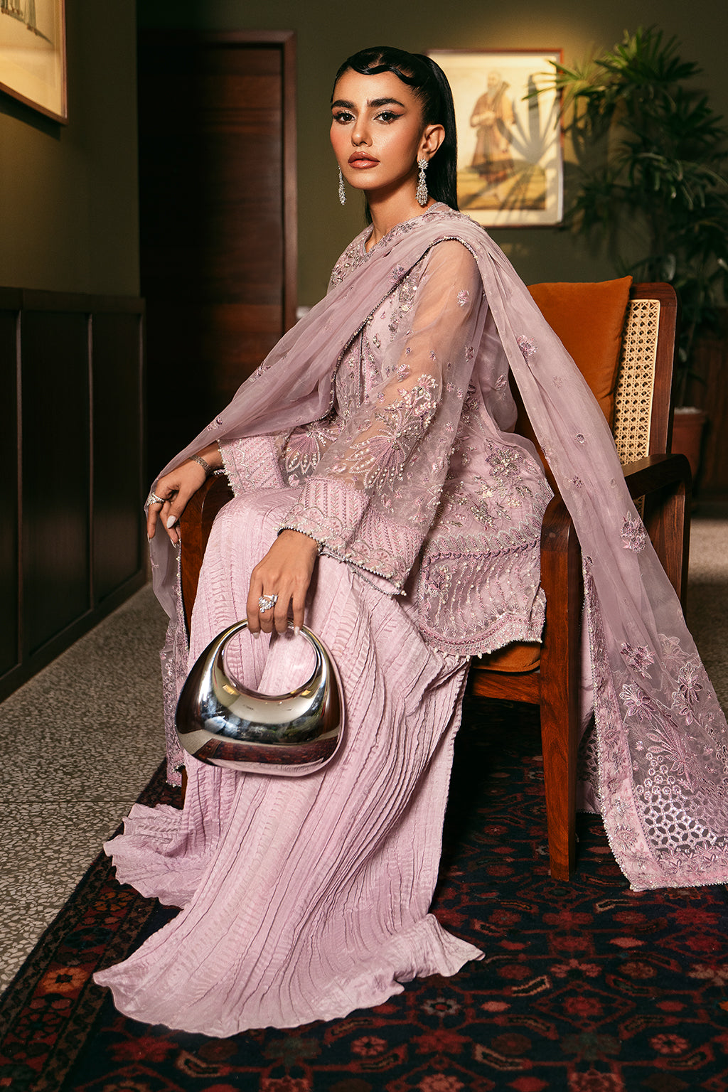 This exquisite dusky lilac short shirt is crafted from luxurious organza, featuring intricate multi-sequin embroidery and delicate hand embellishments on the front and sleeves, adding a touch of elegance and shimmer. Paired with a heavily embroidered organza dupatta, the ensemble exudes sophistication and grace. The raw silk crush bottoms create a voluminous and regal silhouette, ensuring a flattering drape, while the soft lining provides comfort and ease of wear. Perfect for festive occasions, weddings, and formal gatherings, this ensemble blends traditional craftsmanship with contemporary charm, making it a timeless addition to any wardrobe.