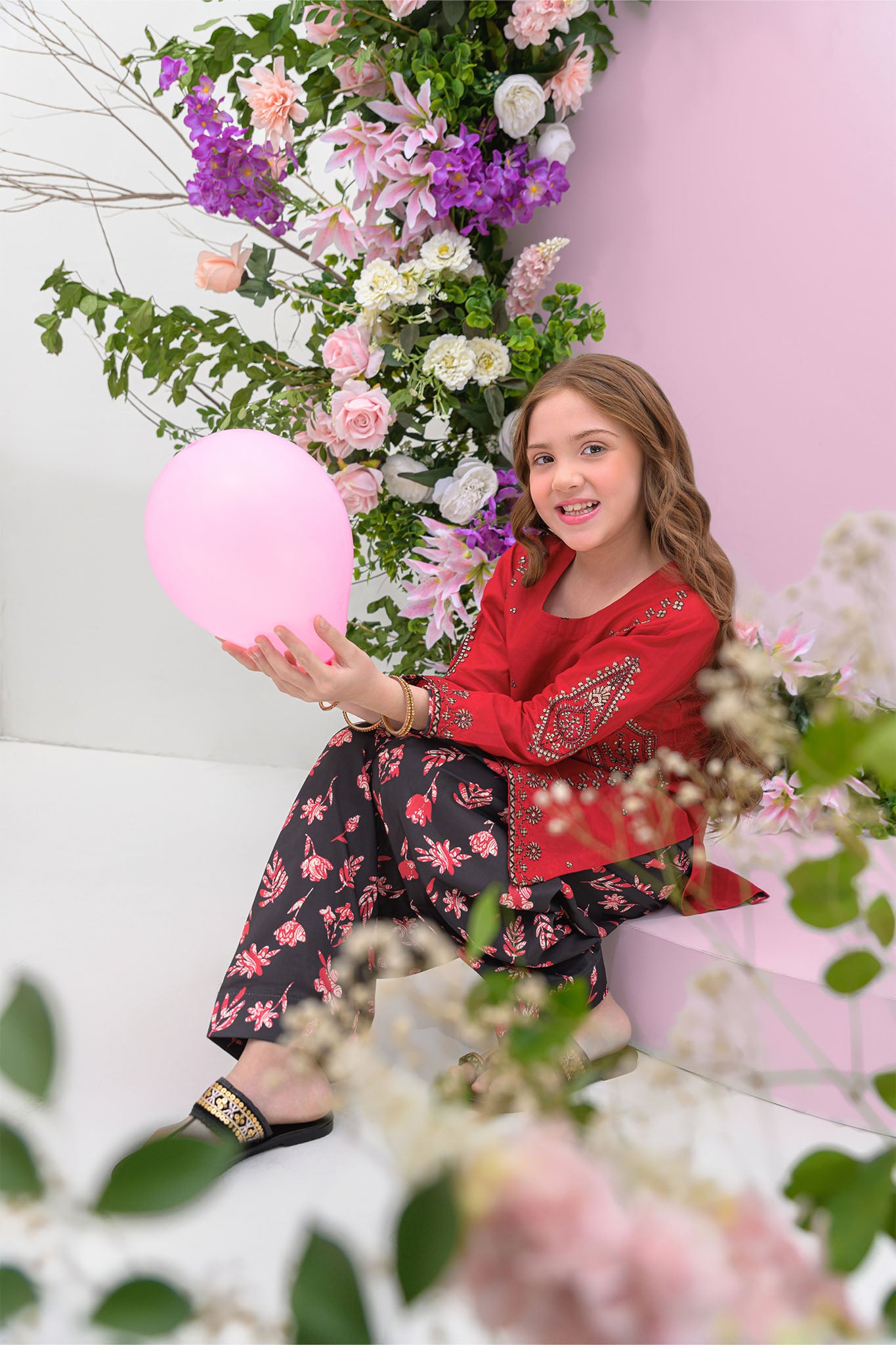 2 piece Red kurta set for girls - festive/party wear for summer/ Embroidered