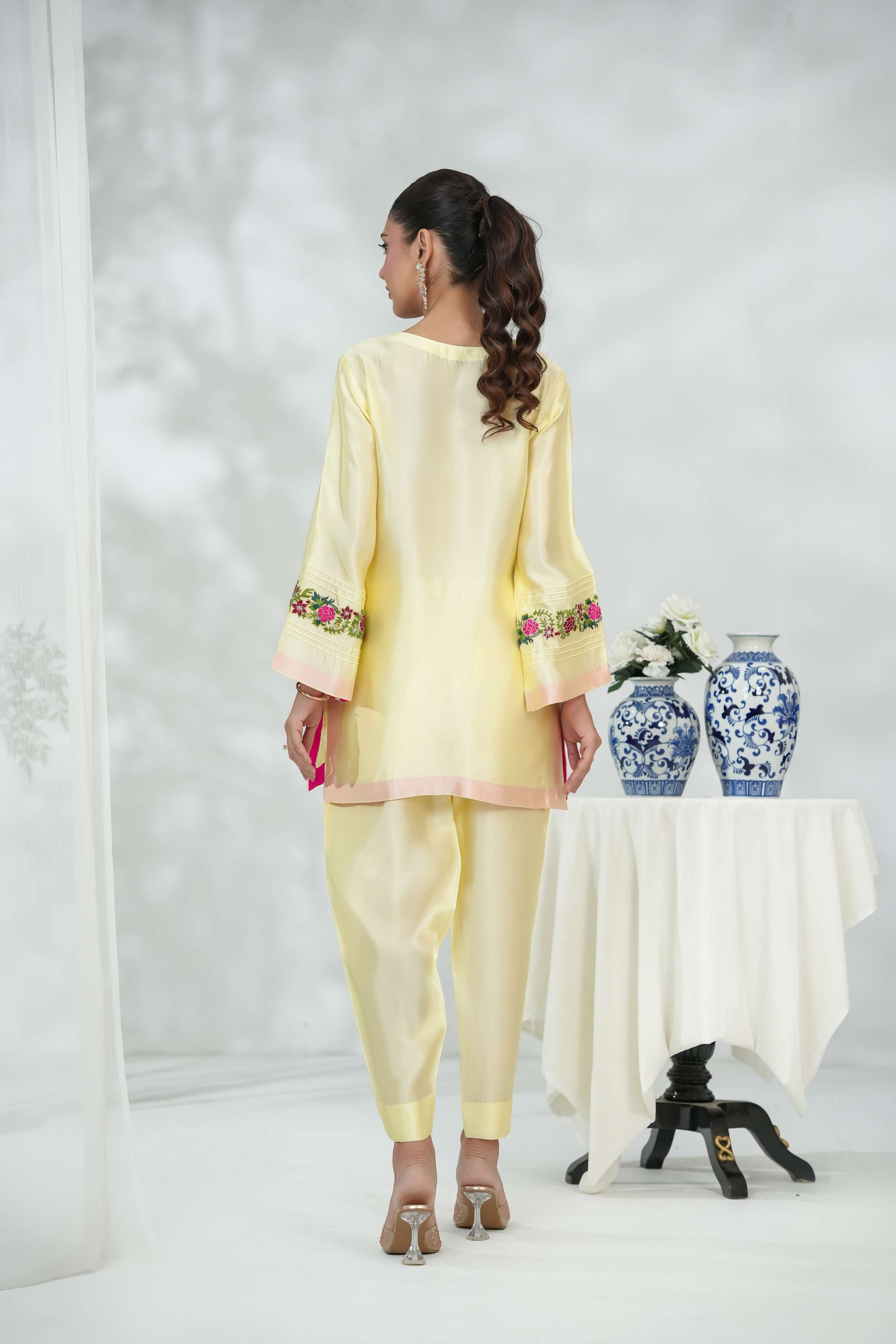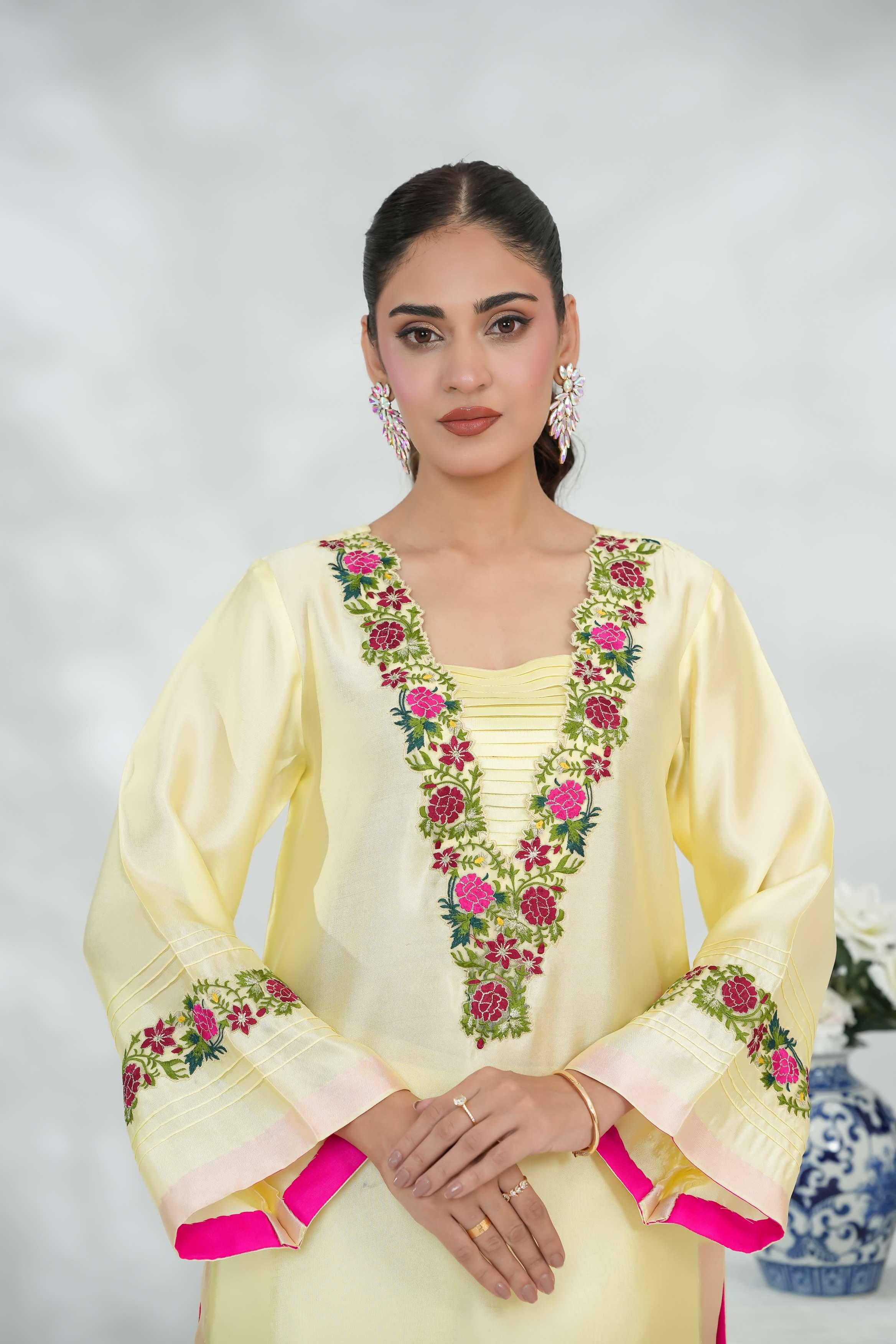 adiate elegance with our Lemon Blossom Silk Ensemble, crafted from premium silk fabric in a soft lemon hue. The shirt features a deep V-neckline adorned with delicate hand-embroidered floral details in vibrant pink and green, paired with flared sleeves finished with contrasting borders. Styled with matching silk trousers, this outfit is a perfect blend of tradition and modern chic—ideal for festive gatherings, weddings, and evening soirées.