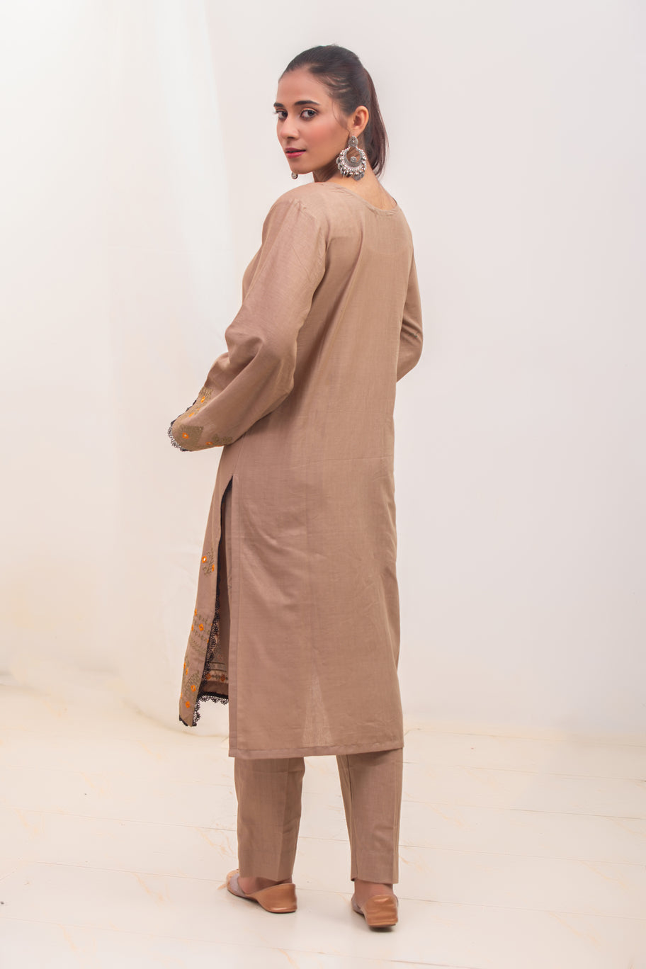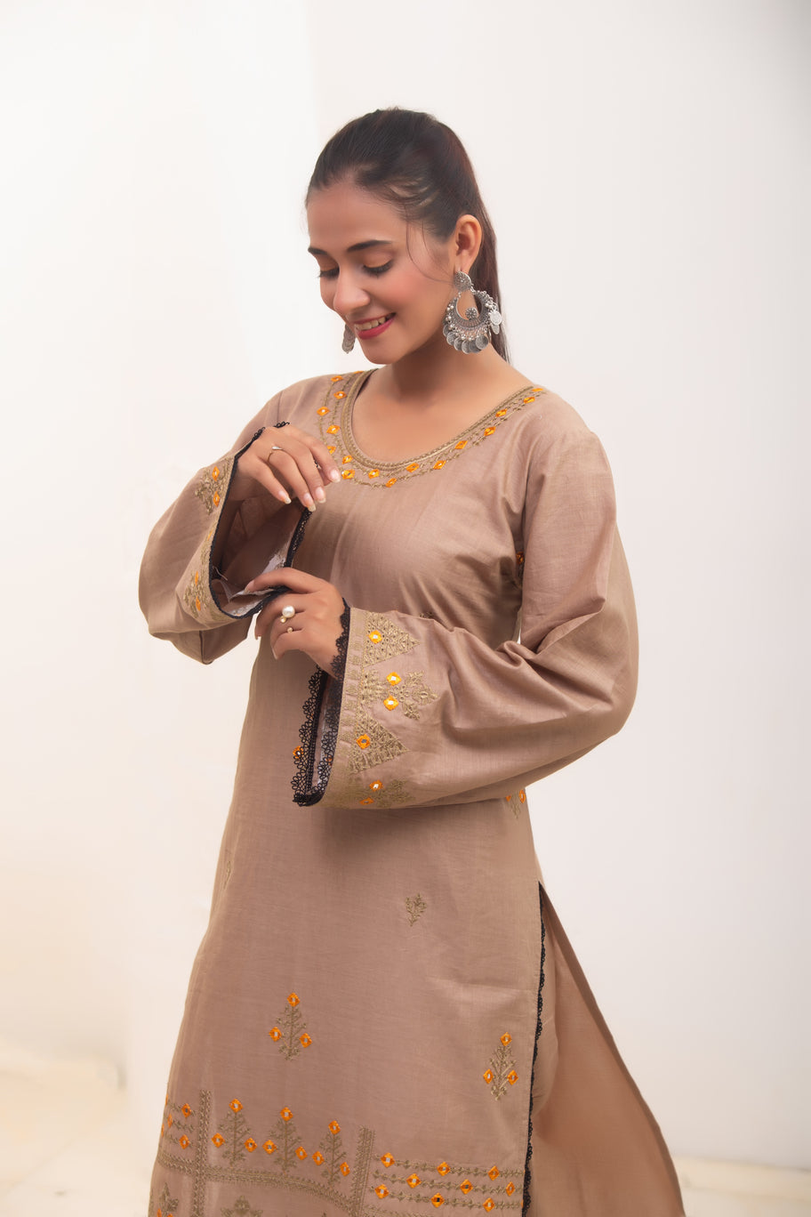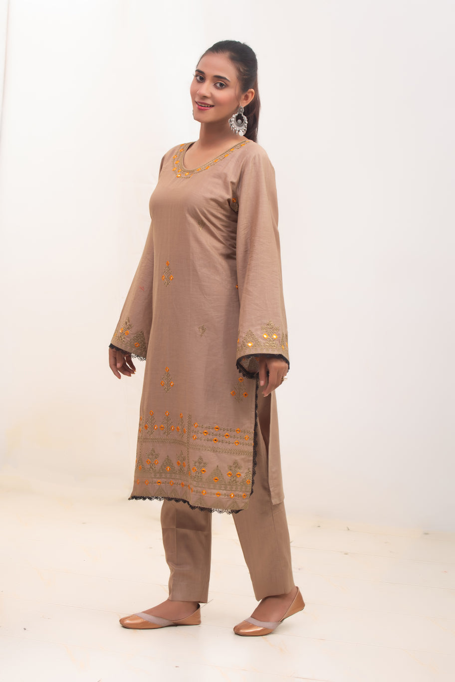 Elevate your everyday style with this elegant 2-piece embroidered kurta set in a soft mocha hue. Crafted from breathable cotton, the outfit features delicate mirror work and floral embroidery in golden and amber tones. The straight-cut kurta with flared sleeves and intricate detailing on the hem exudes timeless grace, while the matching trousers ensure a refined and comfortable fit. Perfect for festive gatherings, casual events, or a classy day out.