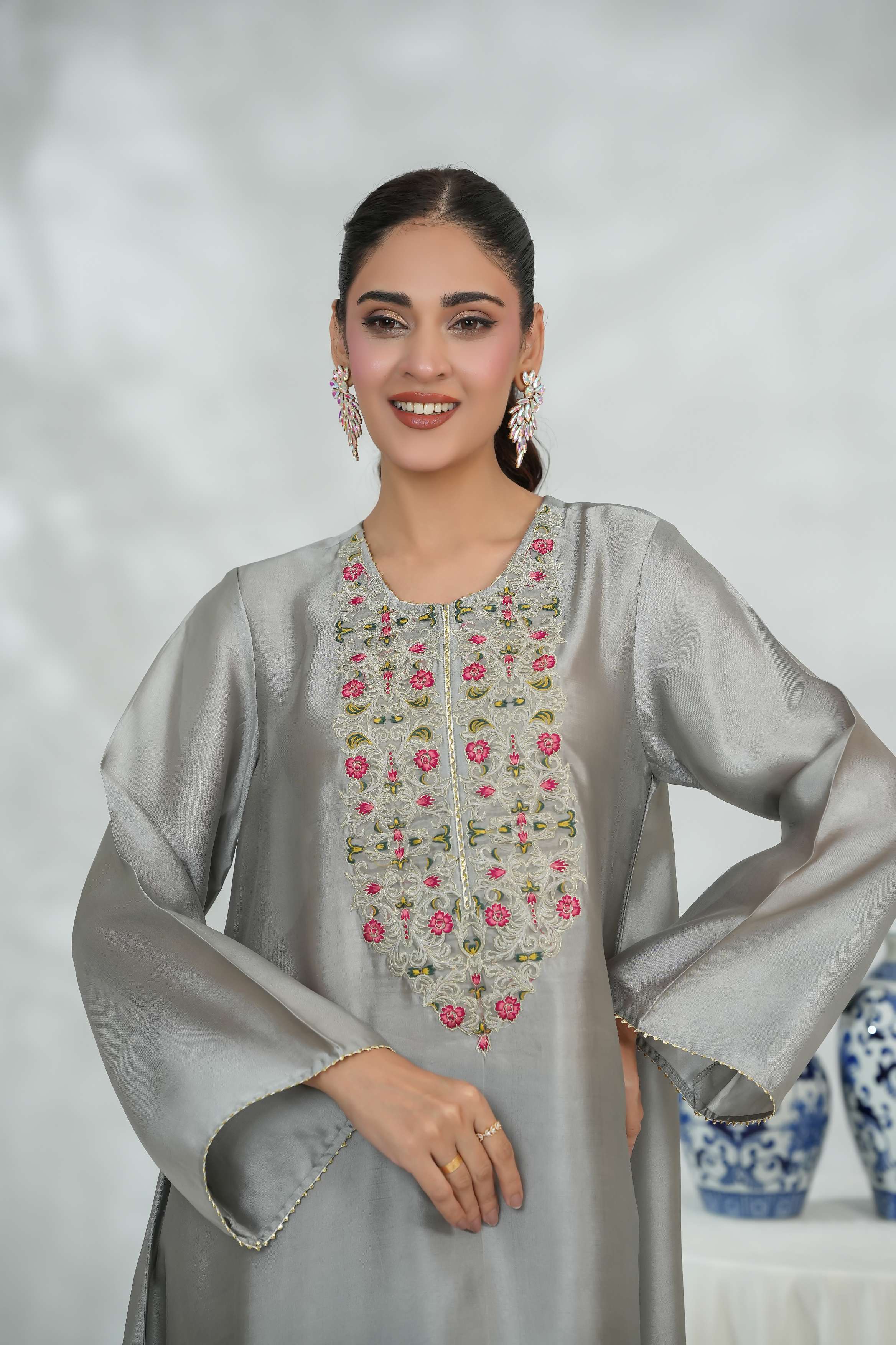 Radiate understated sophistication with Silver Bloom Charm, a graceful silk ensemble in a serene silver-grey hue. The front features delicate hand-embroidered floral motifs in soft pink and sage green, adding a touch of femininity to the minimalist silhouette. The asymmetrical hemline flows effortlessly, paired with matching straight pants for a timeless and refined look. Perfect for festive gatherings or elegant soirées.