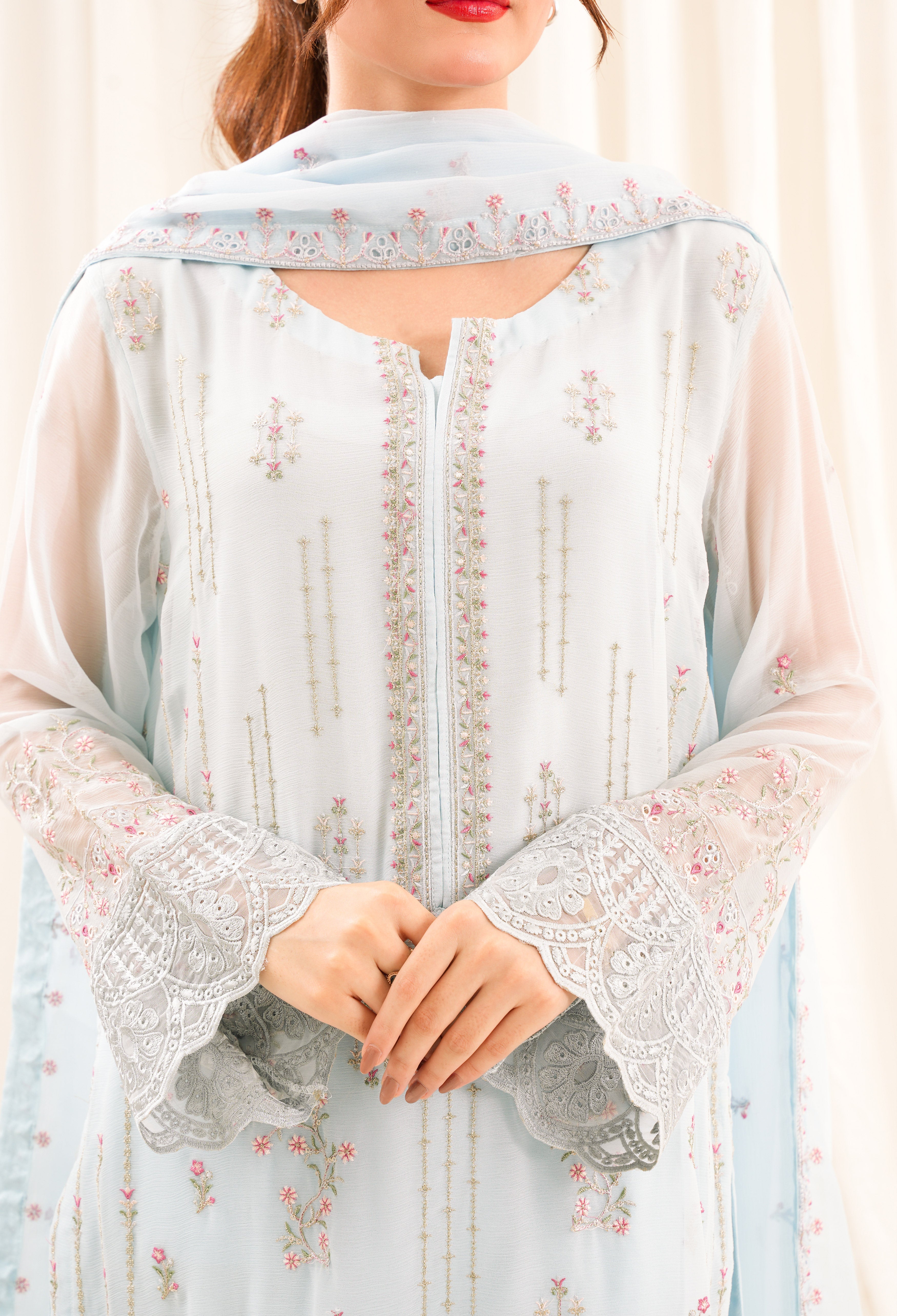 Experience luxury with our Sky Blue 3 piece suit made from fine chiffon and intricately embroidered. Elevate your style and stand out in any occasion.