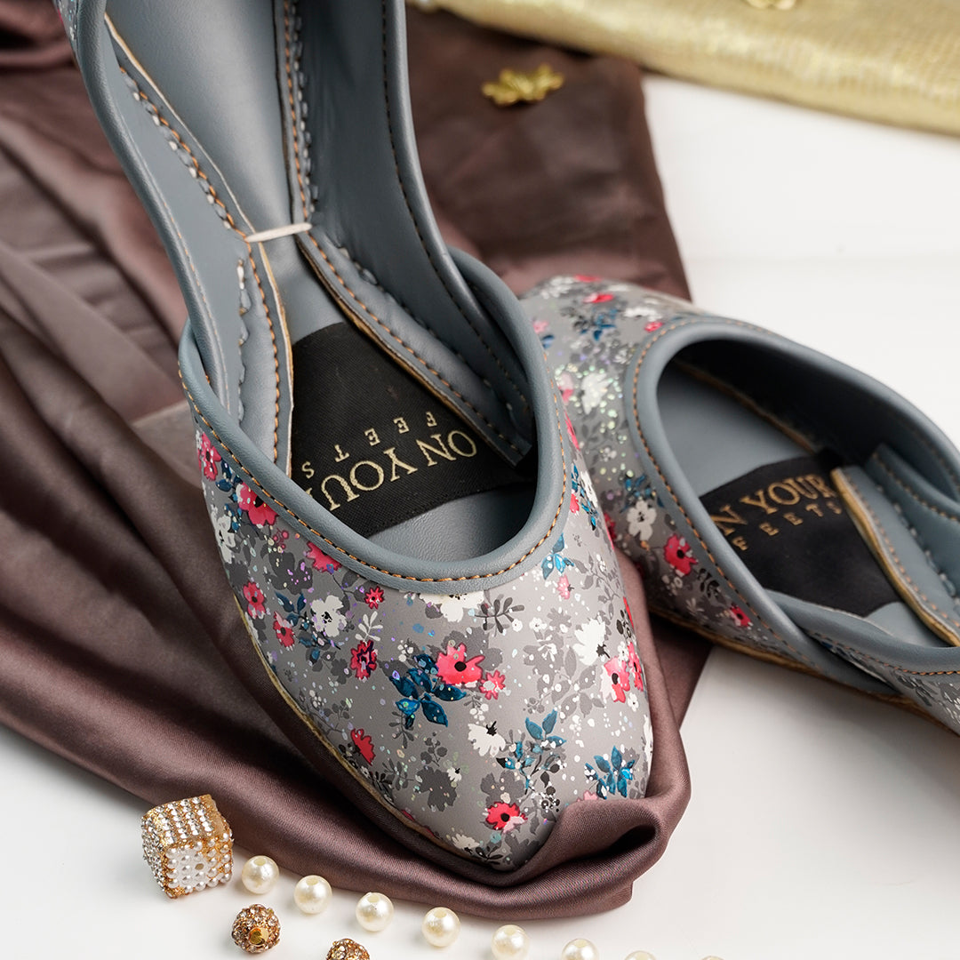 Elevate your everyday elegance with the Slate Blossom Comfort khussa, where tradition meets a modern twist. Set against a cool grey base, these khussa bloom with a delicate mix of pink, white, blue, and black floral prints, creating a graceful yet trendy look. The soft padded inner sole and supple faux leather lining ensure all-day comfort without compromising on style. Whether you're heading to a festive event or just sprucing up your casual outfit, these juttis offer a chic, effortless vibe.