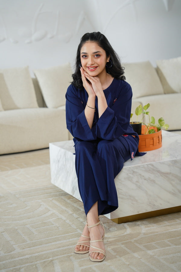 Stone Linen A rich navy shirt adorned with vibrant floral embroidery in orange, pink, and green. The bold palette adds a lively touch to everyday elegance.