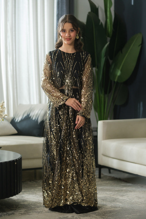 A luxurious black frock paired with a sheer coat adorned in intricate gold embroidery. Vertical and radial motifs shimmer across the hem and sleeves, creating a dramatic silhouette fit for festive evenings and formal occasions. The rich contrast of black and gold evokes timeless elegance with a modern edge.