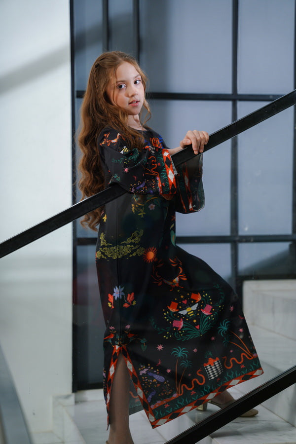 Bold and dramatic, this black kaftan bursts with colorful florals and rich red detailing for a striking evening look.