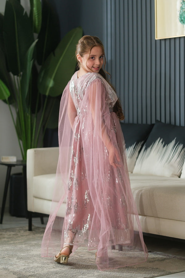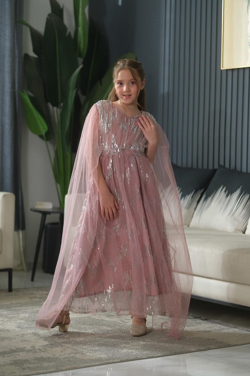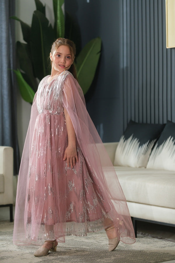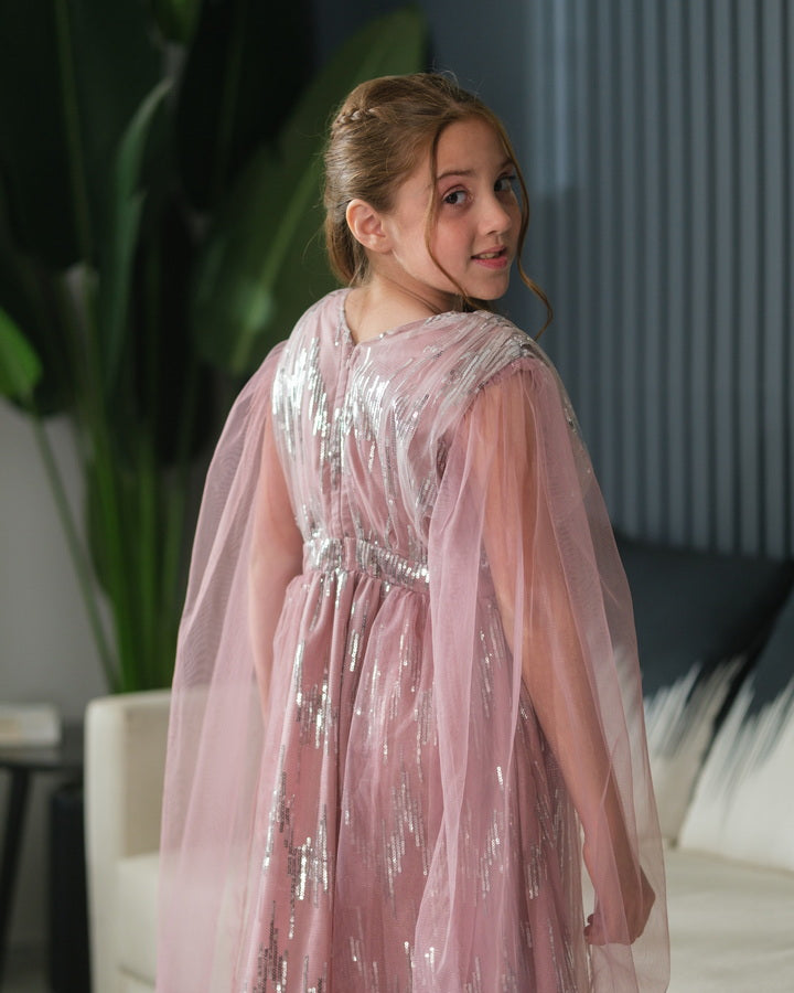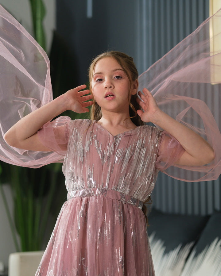 A soft pink dress with silver embellishments and a sheer overlay. Featuring a V-neckline and cinched waist, it radiates charm and sophistication for special celebrations.