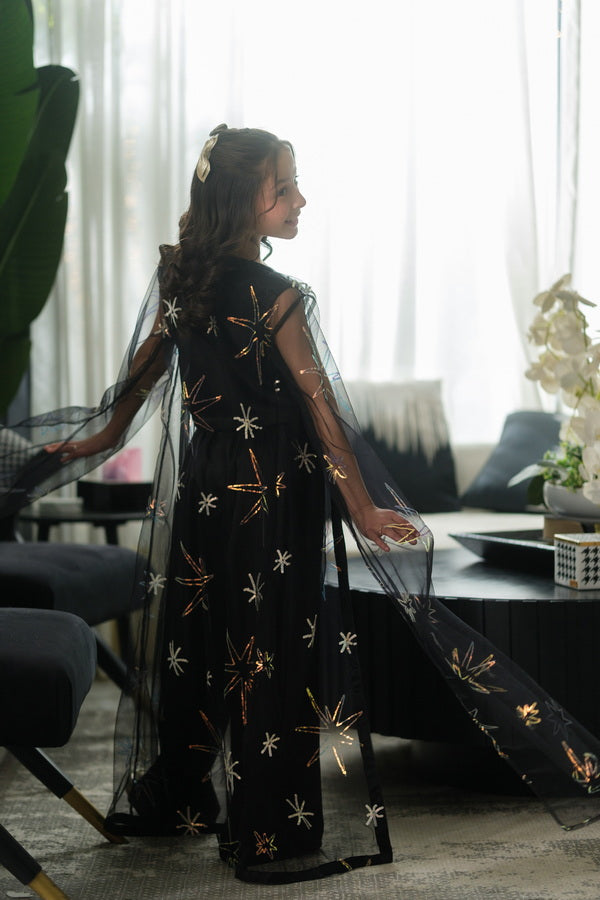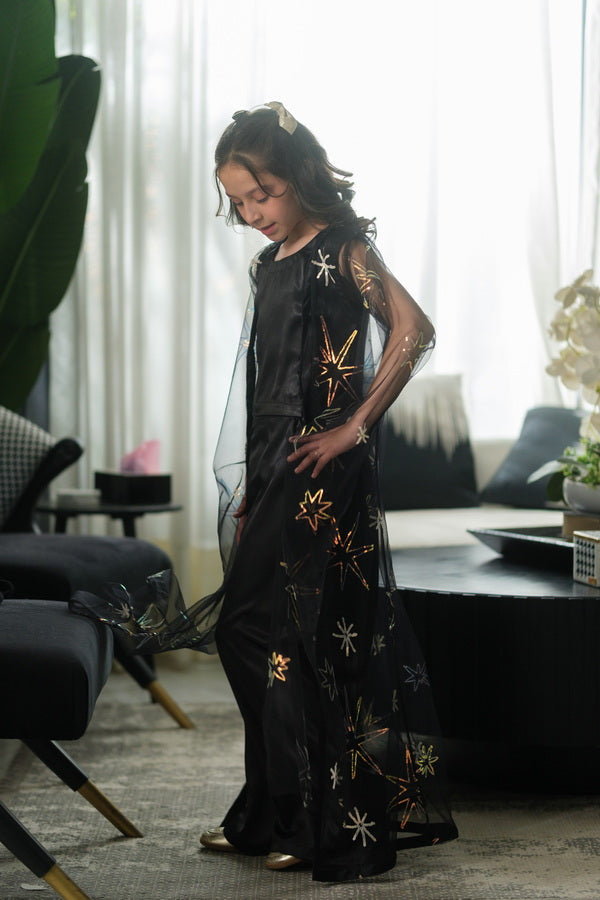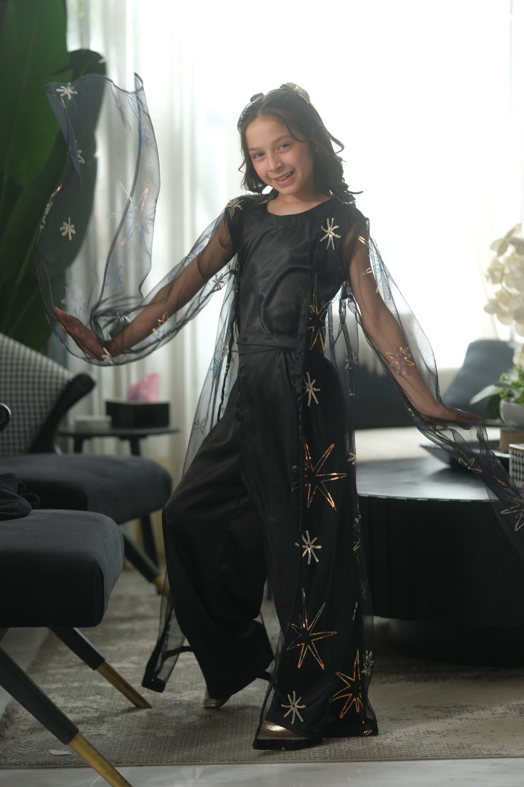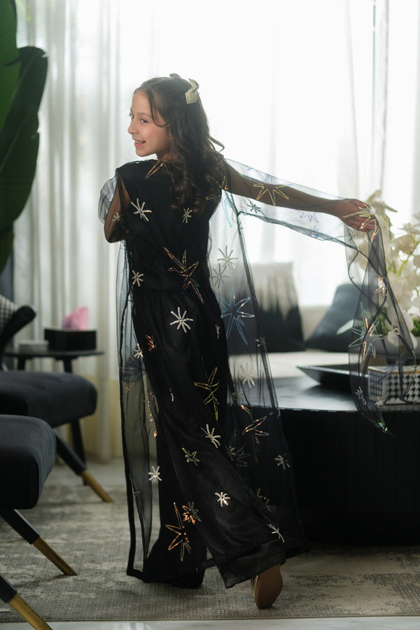 A striking black ensemble featuring a plain shirt and trousers paired with a sheer ankle-length coat embroidered in white and gold starburst motifs. The flowing silhouette and celestial detailing create a look that’s both graceful and bold — perfect for evening wear or festive occasions.