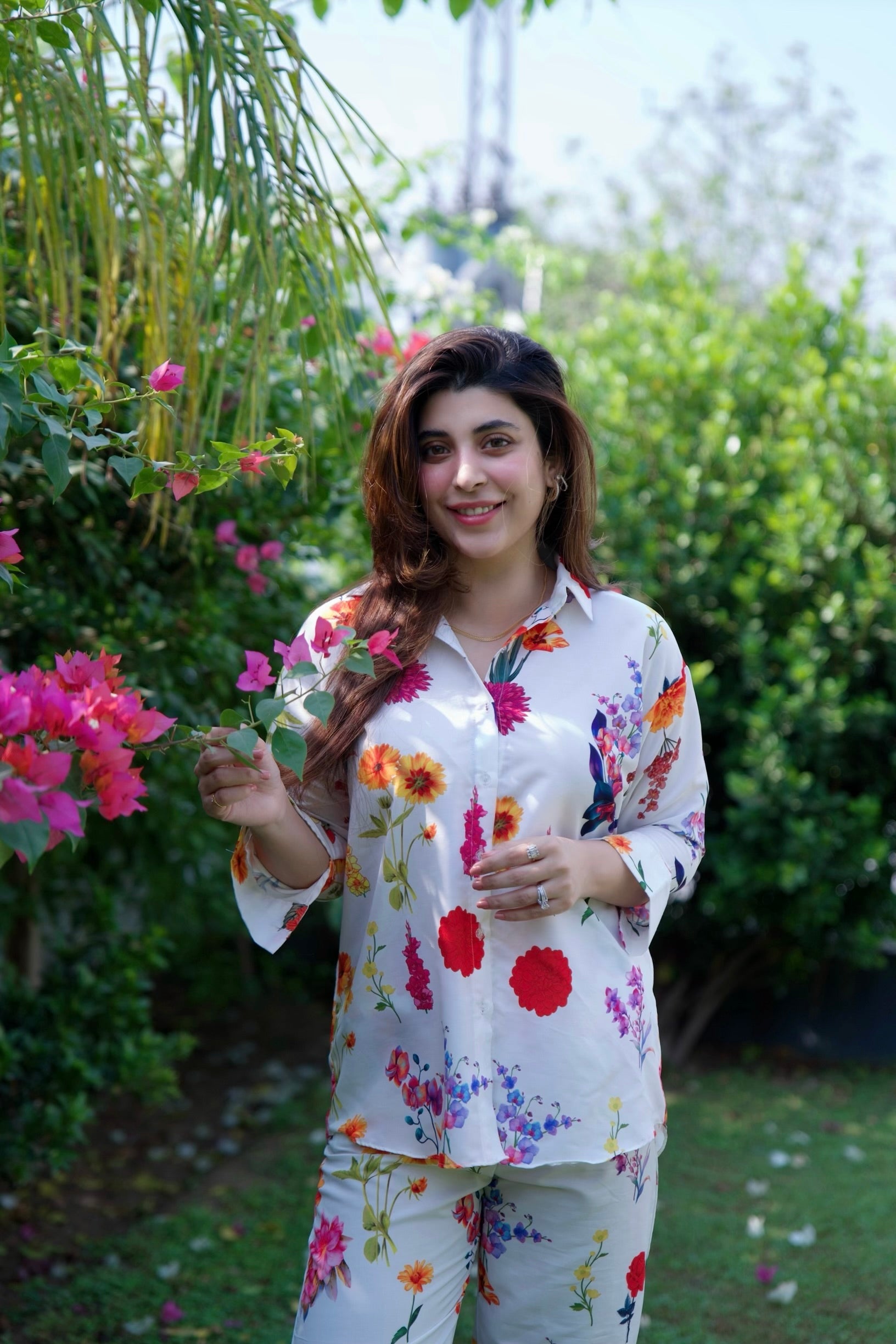 The radiant ensemble offers a unique and stylish look for any special occasion. This 2-piece Co-ord features a chic contemporary short shirt with minimal floral prints. The matching trousers make it a trendy outfit to style.