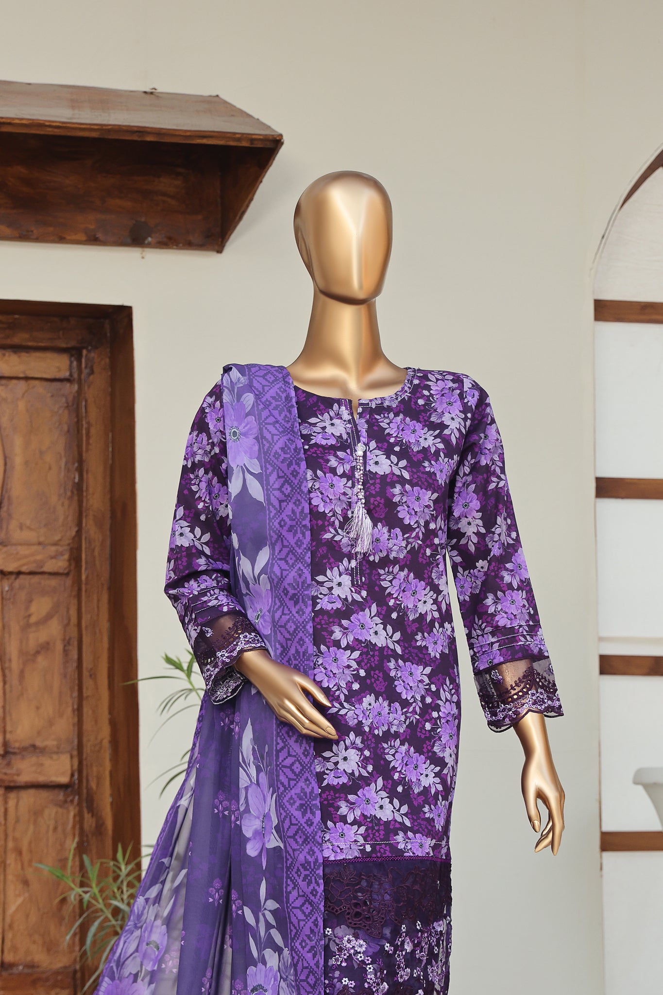 Sumi Stitched 3 Piece Embroidered & Printed Suit-CPE-02-Purple