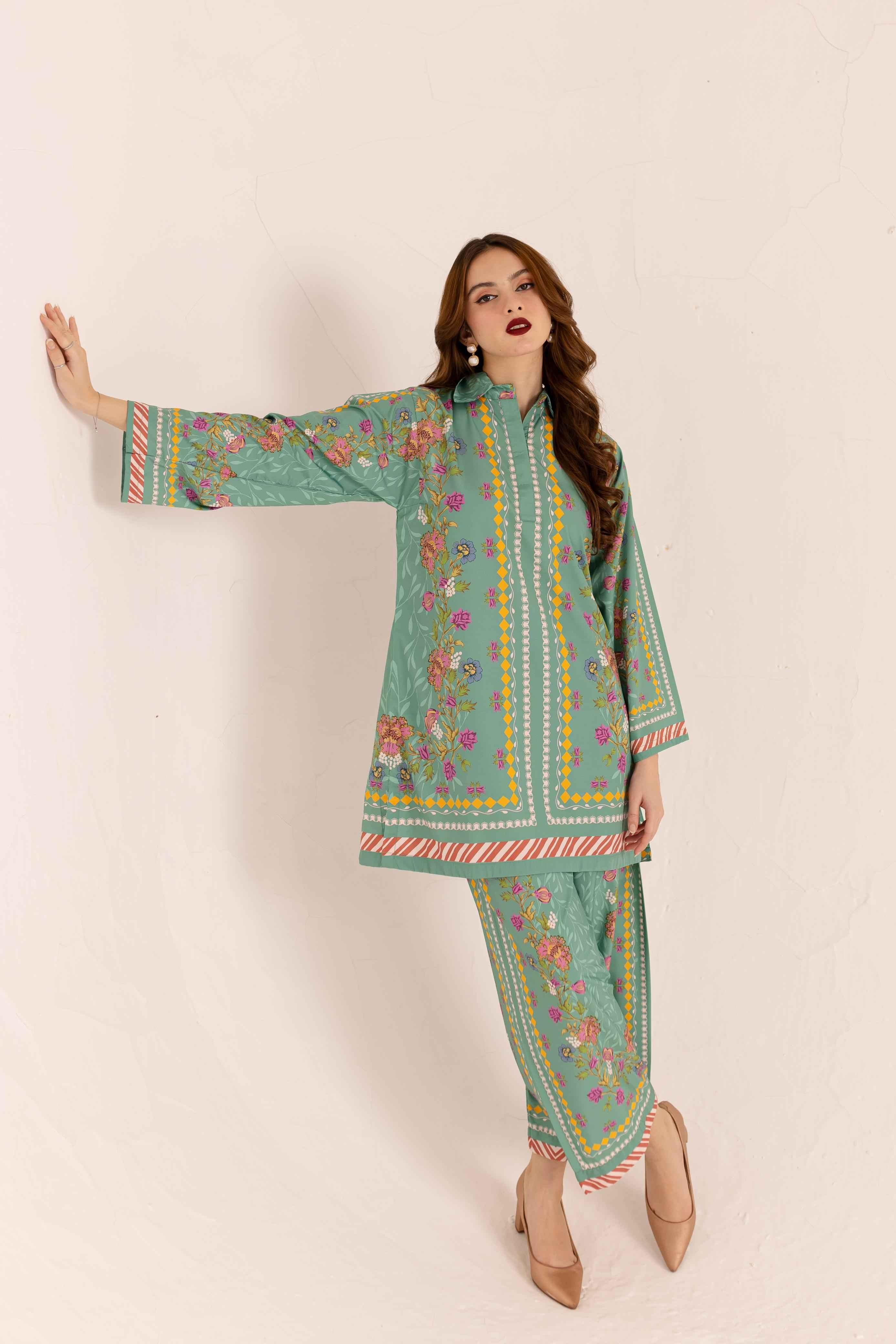 Brighten up your wardrobe with this bold and colorful ensemble! This outfit features a striking mix of floral digital prints in vibrant shades, The long V-neck shirt is crafted for both style and comfort, with loose-fitting sleeves for a relaxed yet chic look.