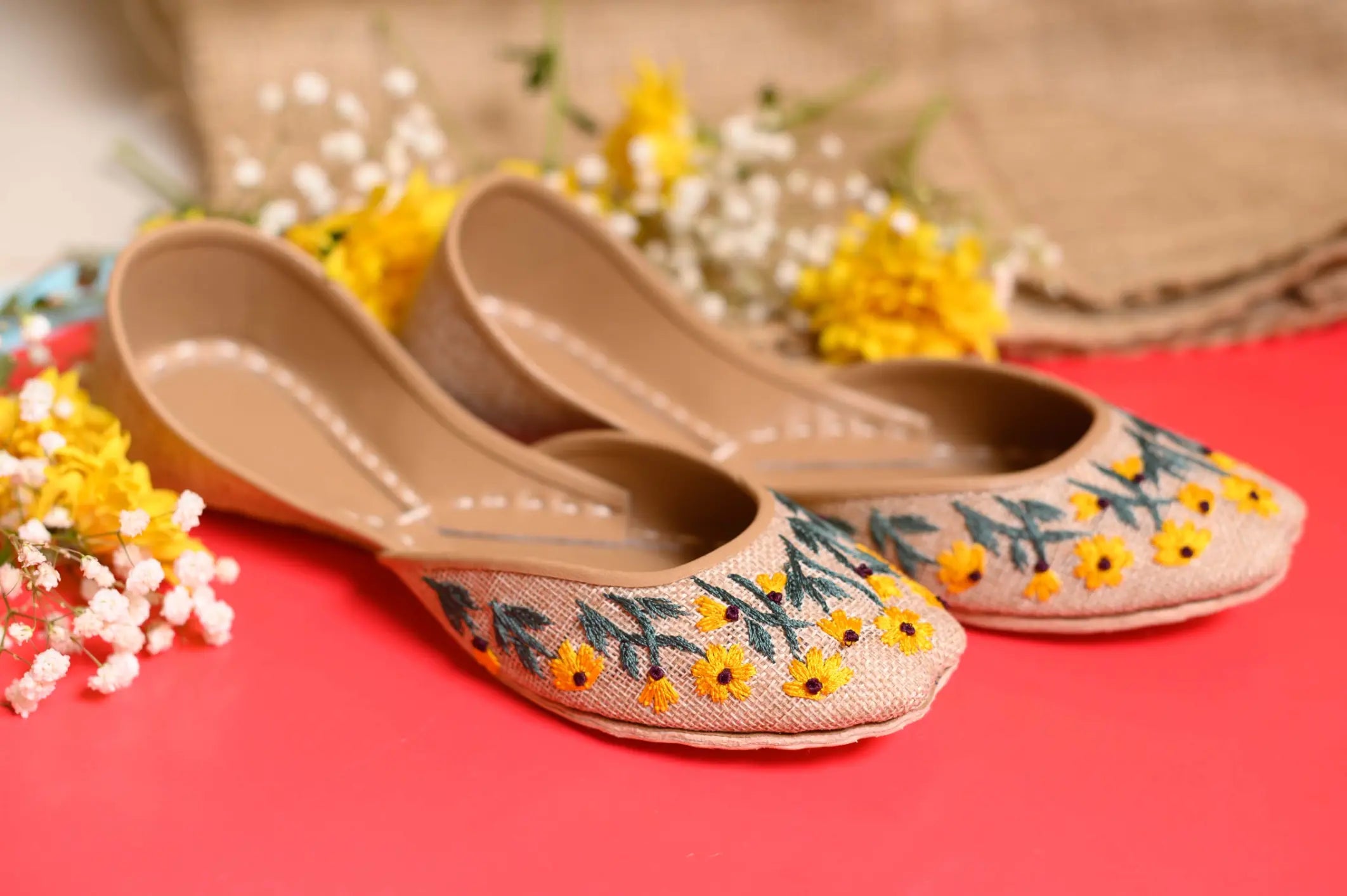Detail: Jute base with yellow sunflowers embroidered across the front, a winsome pair that is perfect for styling Western wear