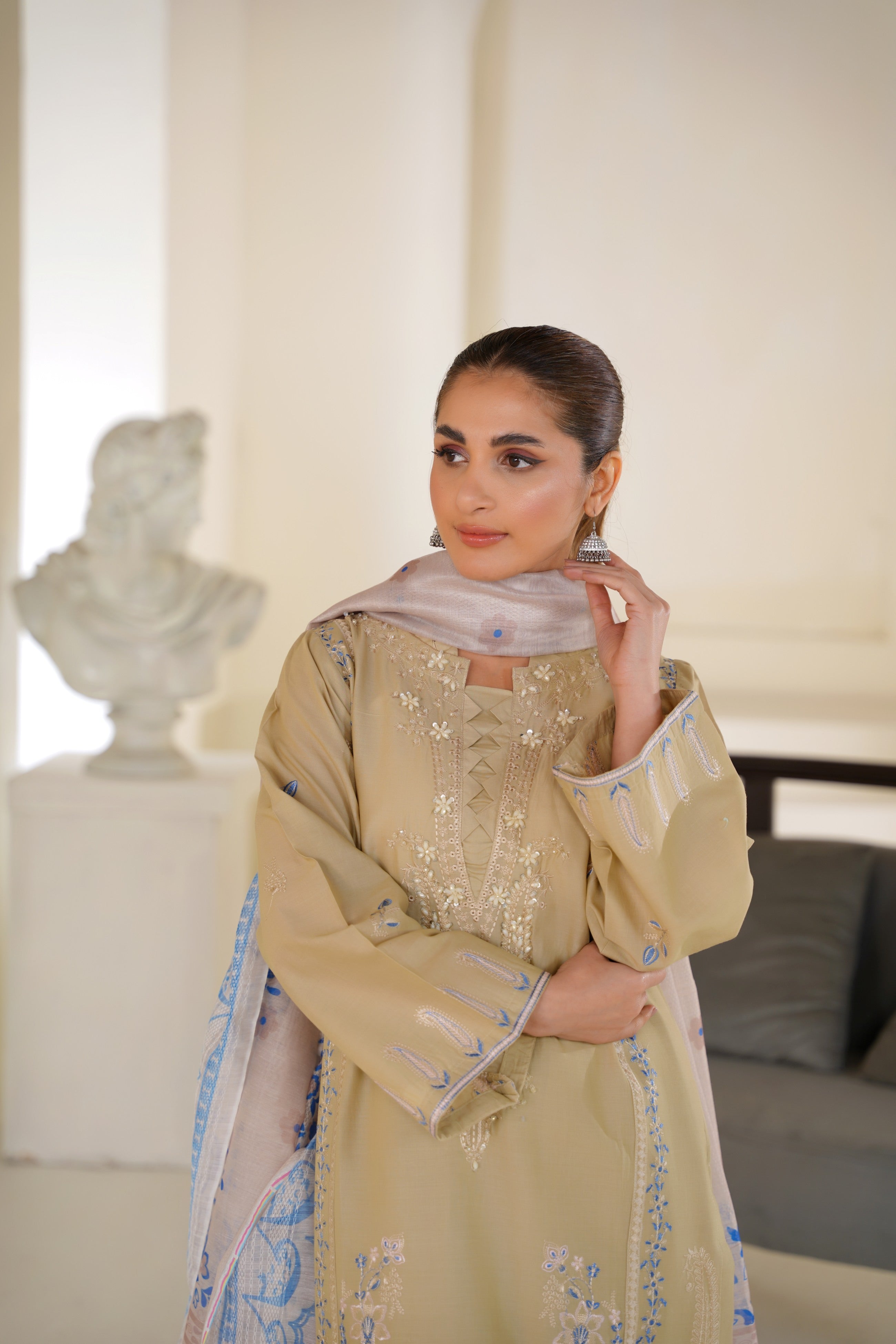 Discover understated elegance with our Sapphire Sand embroidered ready-to-wear ensemble. Crafted in a soothing sand-beige tone, this outfit features a beautifully embroidered lawn shirt with intricate threadwork and delicate lace finishing. It is paired with matching lawn trousers and enhanced with a striking printed dupatta in Nino Karra fabric with bold sapphire blue borders, adding a graceful contrast. Perfect for summer evenings, festive lunches, and elegant daytime wear.