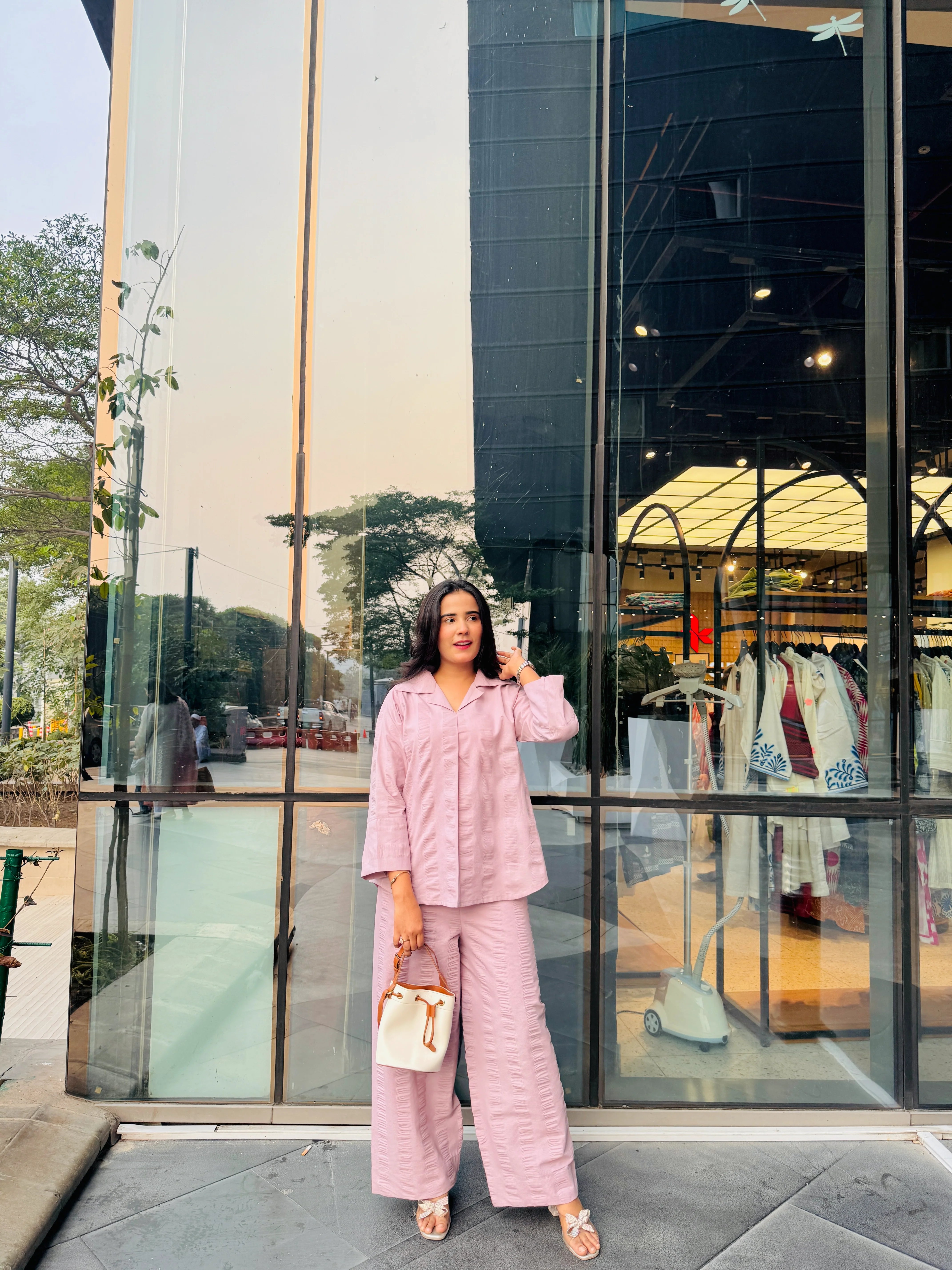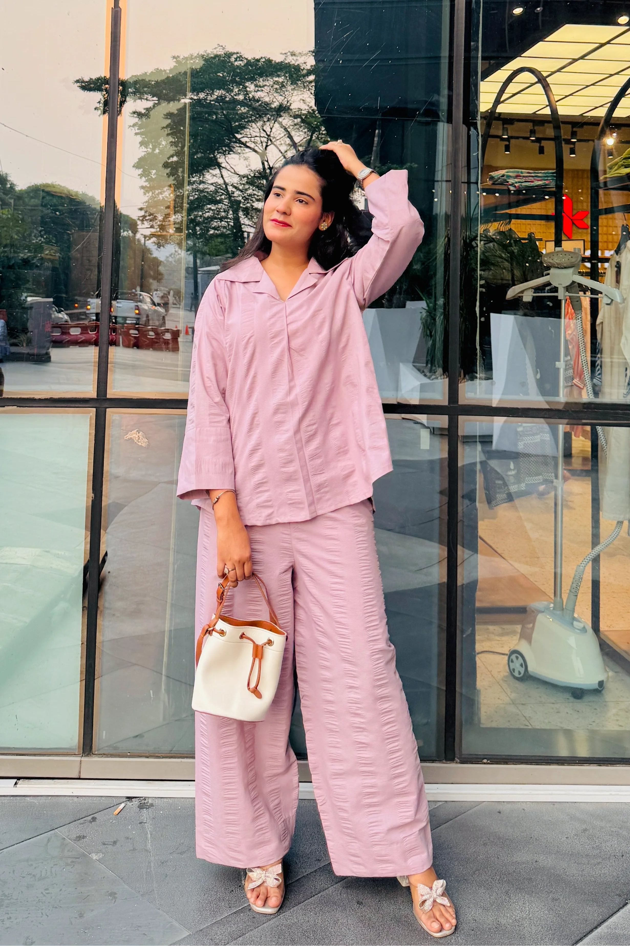 Description:A chic 2-piece casual co-ord set crafted from breathable seersucker cotton. The top features a smart collar neckline with full sleeves, offering effortless style and comfort. Paired with wide-leg matching pants, this versatile outfit is perfect for everyday outings, coffee dates, and modern street-style looks. Lightweight, airy, and stylish — an essential wardrobe staple for the season.