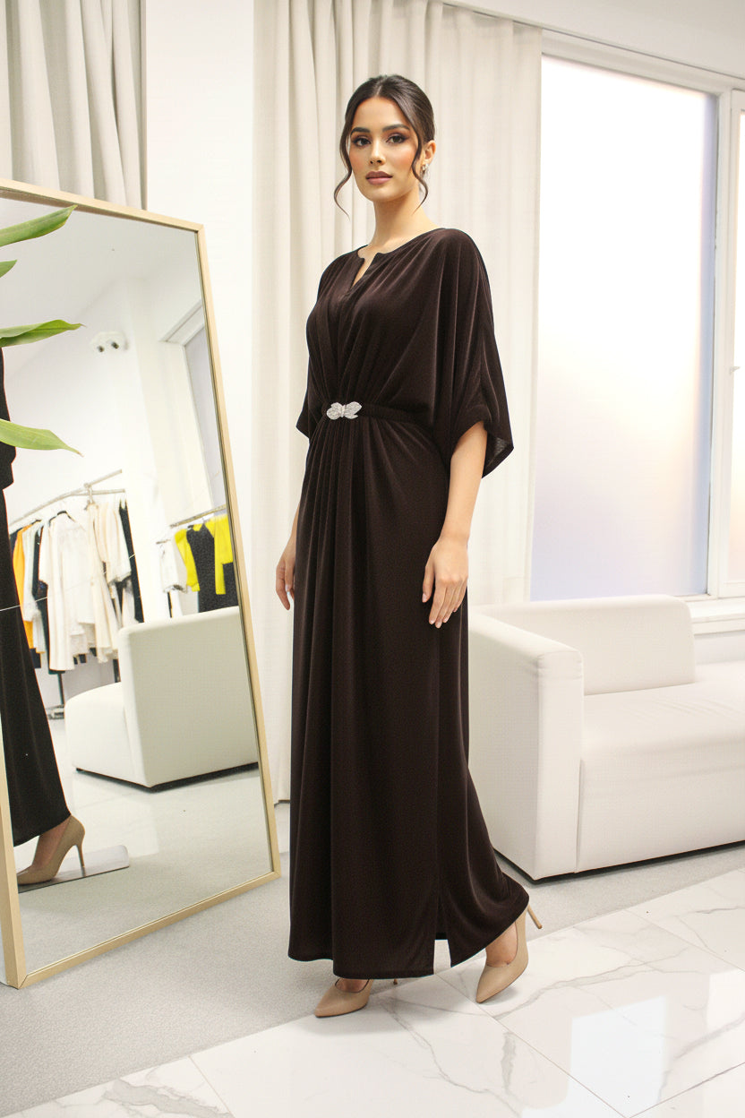 Blending regal charm with winter warmth, VELORIA embodies the essence of timeless sophistication. Each kaftan crafted from premium imported velvet - flows with graceful ease, offering an elegant silhouette that combines modern refinement with traditional modesty. The smooth velvet texture, radiant sheen, and crystal-embellished brooches bring understated glamour to every movement.