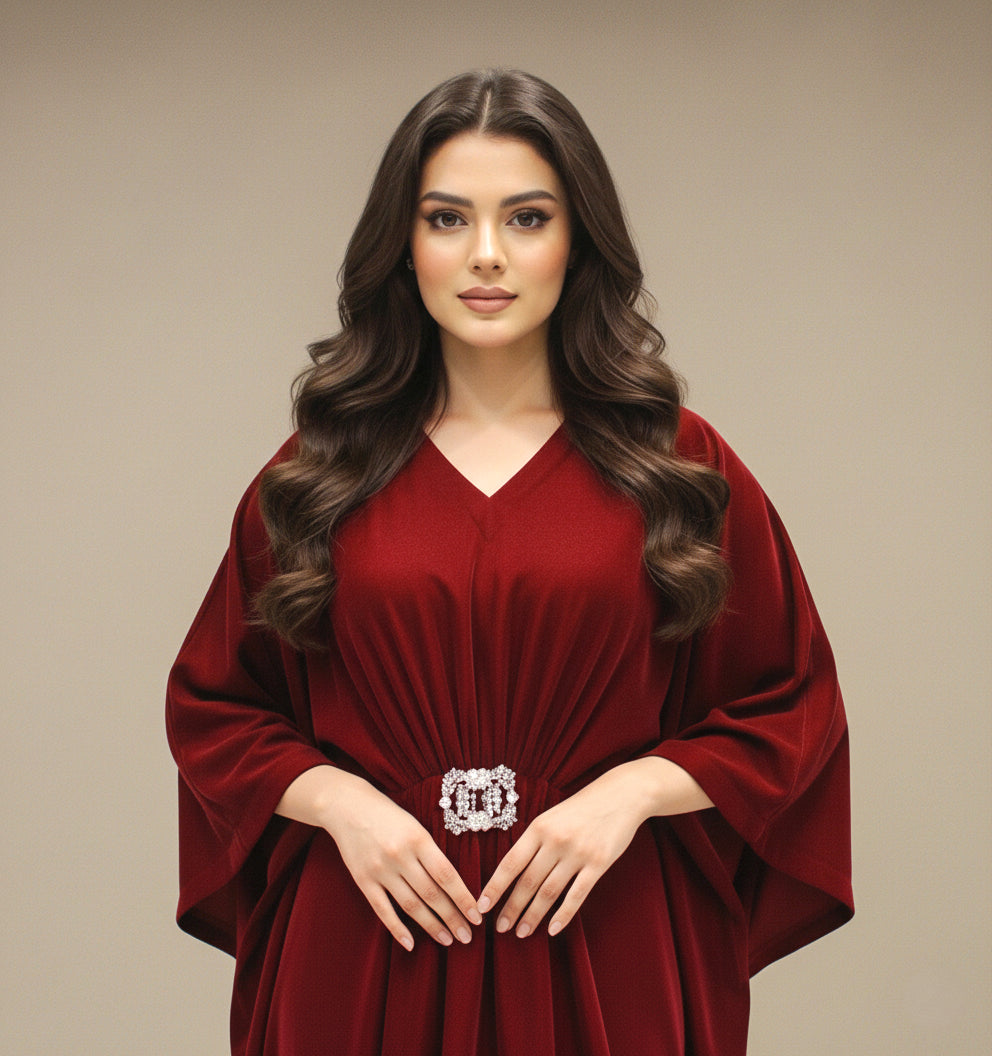 Blending regal charm with winter warmth, VELORIA embodies the essence of timeless sophistication. Each kaftan crafted from premium imported velvet - flows with graceful ease, offering an elegant silhouette that combines modern refinement with traditional modesty. The smooth velvet texture, radiant sheen, and crystal-embellished brooches bring understated glamour to every movement.