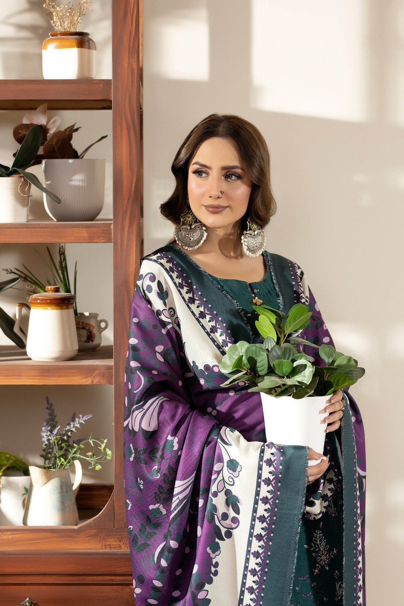 Laila is a three-piece winter ensemble crafted from soft, warm khaddar, designed to offer comfort with a refined sense of style. The deep teal shirt features a long, straight silhouette with full sleeves, adorned with delicate floral and paisley-inspired prints in purple, white, and subtle gold. The neckline is thoughtfully detailed, adding an elegant touch to the overall design.