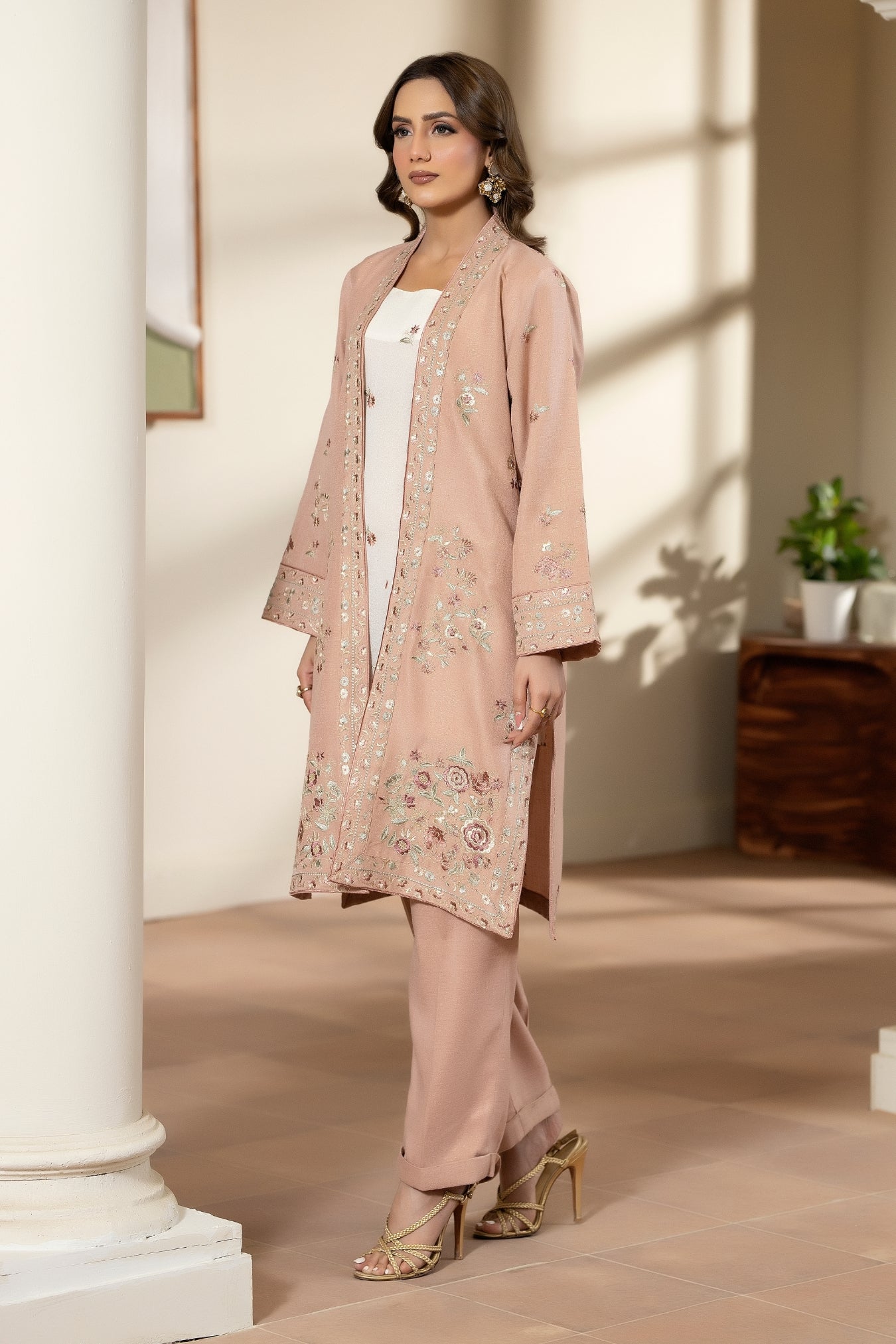 Nur is a refined three-piece ensemble designed with a modern, elegant silhouette—perfect for festive gatherings, formal events, or sophisticated daytime occasions. The outfit features a long, open-front jacket in a soft dusty rose tone, crafted from a jacquard whole-silk blend that offers both structure and graceful movement. Delicate pastel-toned floral embroidery is thoughtfully placed along the front borders, sleeves, and lower hem, complemented with subtle sequins or beadwork for a gentle, elevated shimmer.