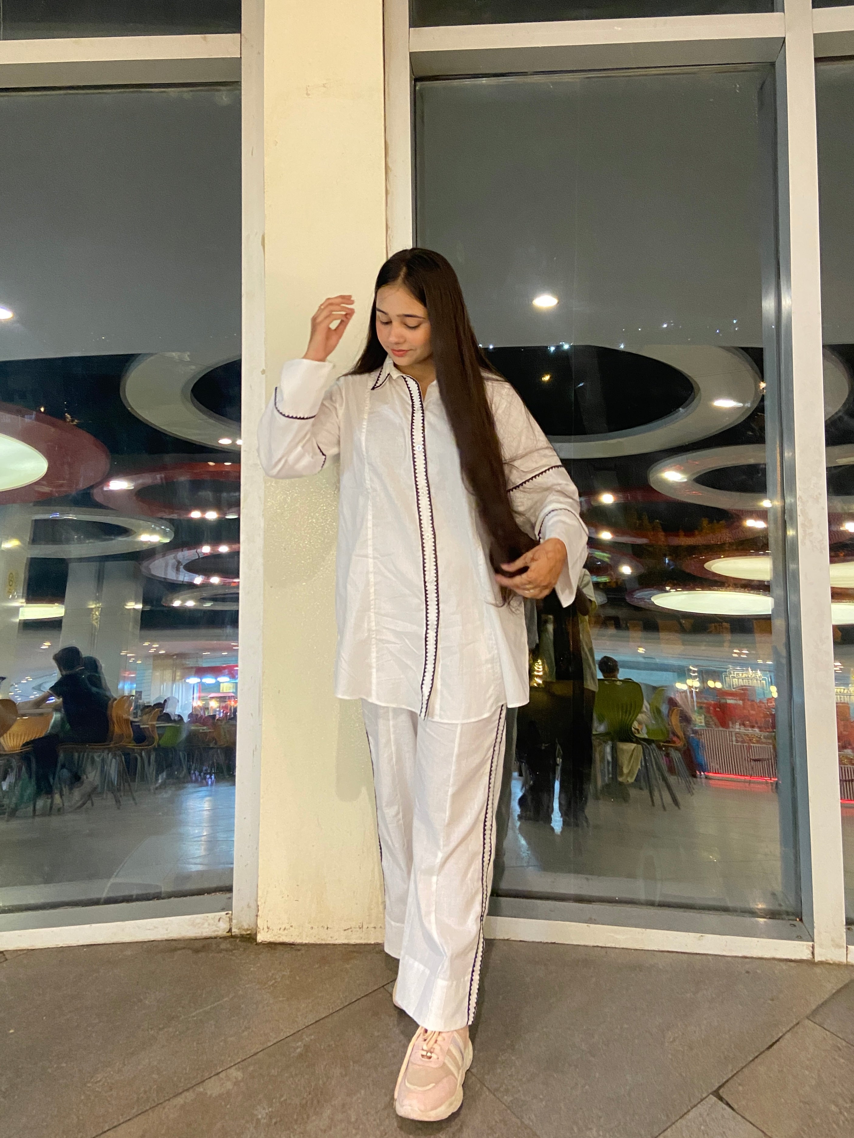 Elevate your everyday style with this elegant 2-piece coord set in classic white. Designed with a long button-down shirt and matching straight-fit trousers, the set is enhanced with subtle contrast piping on the front and sleeves for a chic finish. Made from lightweight and breathable fabric, it’s perfect for casual outings, meetups, or effortless everyday wear.